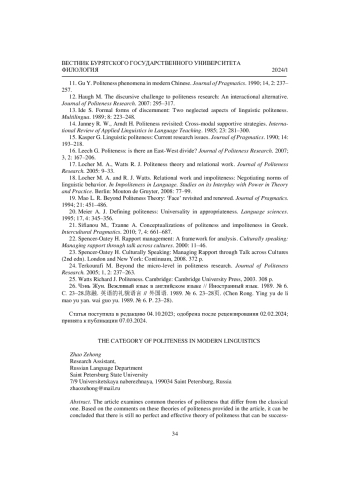 11. Gu Y. Politeness phenomena in modern Chinese. Journal of Pragmatics. 1990; 14, 2: 237257.