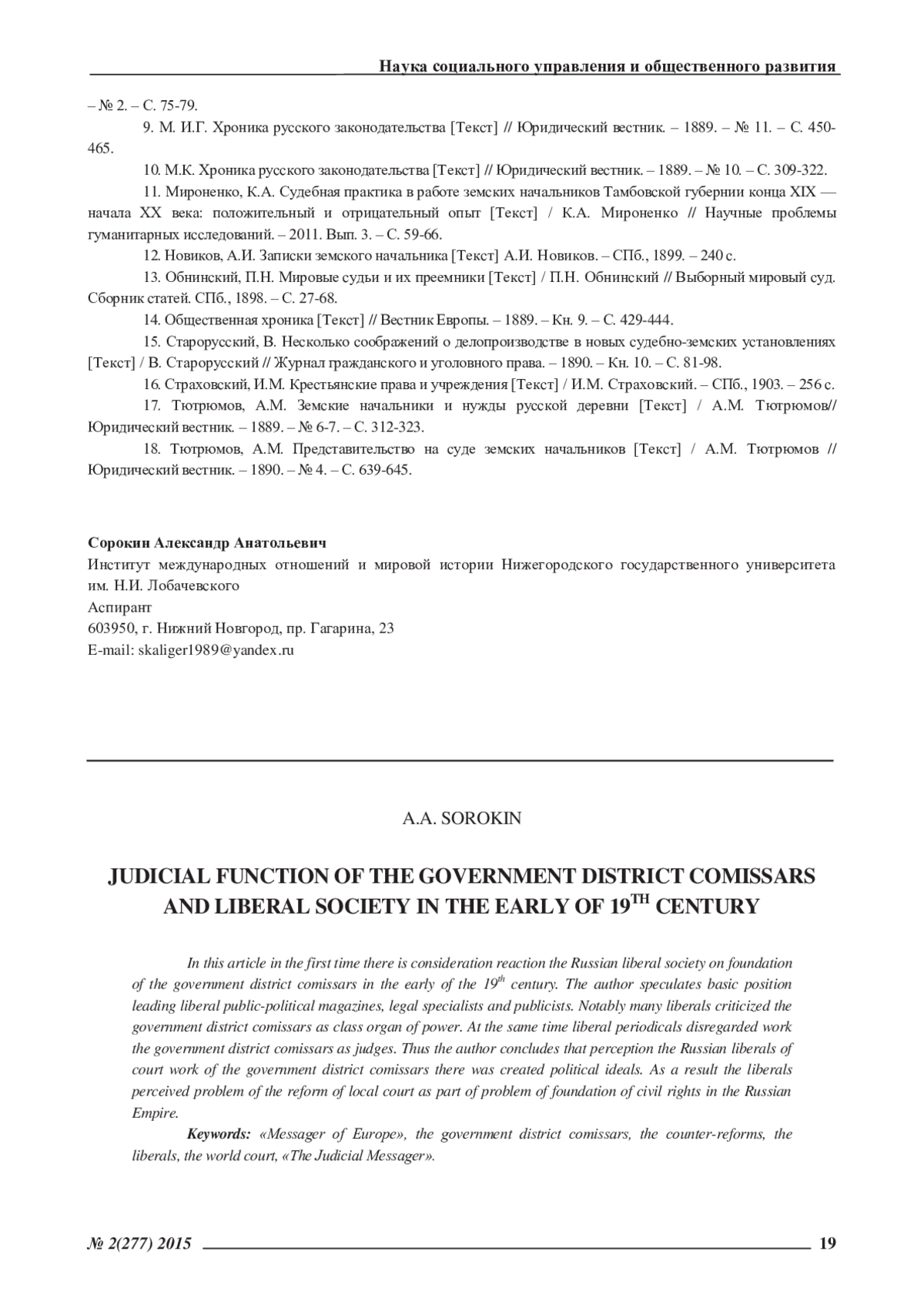18. Тютрюмов, А.М. Представительство на суде земских начальников [Текст] / А.М. Тютрюмов // Юридический вестник. - 1890. - № 4. - С. 639-645.