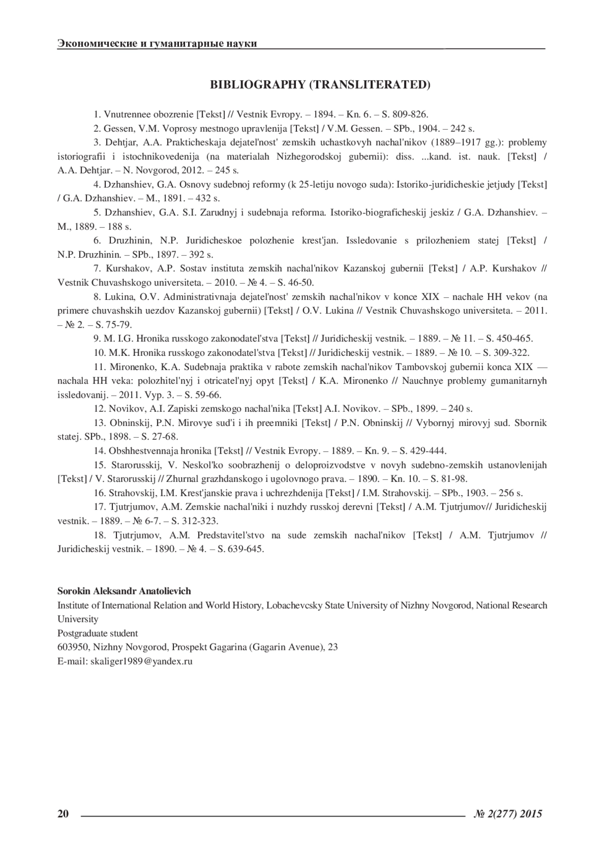3. Дехтяр, А.А. Практическая деятельность земских участковых начальников (1889-1917 гг.): проблемы историографии и источниковедения (на материалах Нижегородской губернии): дисс..канд. ист. наук. [Текст] / А.А. Дехтяр. - Н. Новгород, 2012. - 245 с. EDN: QFMUQP