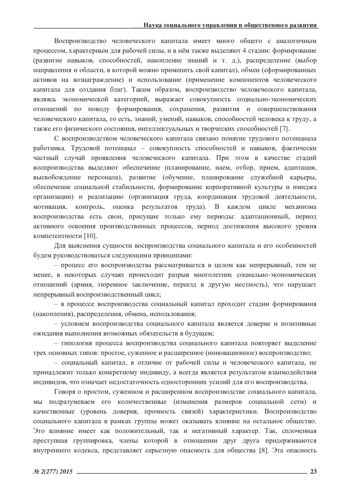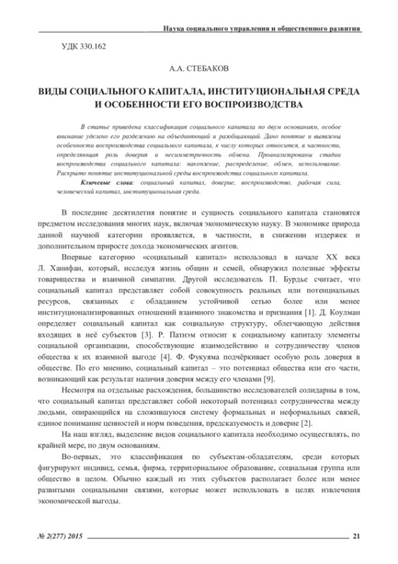 В статье приведена классификация социального капитала по двум основаниям, особое внимание уделено его разделению на объединяющий и разобщающий. Дано понятие и выявлены особенности воспроизводства социального капитала, к числу которых относится, в частности, определяющая роль доверия и несимметричность обмена. Проанализированы стадии воспроизводства социального капитала: накопление, распределение, обмен, использование. Раскрыто понятие институциональной среды воспроизводства социального капитала