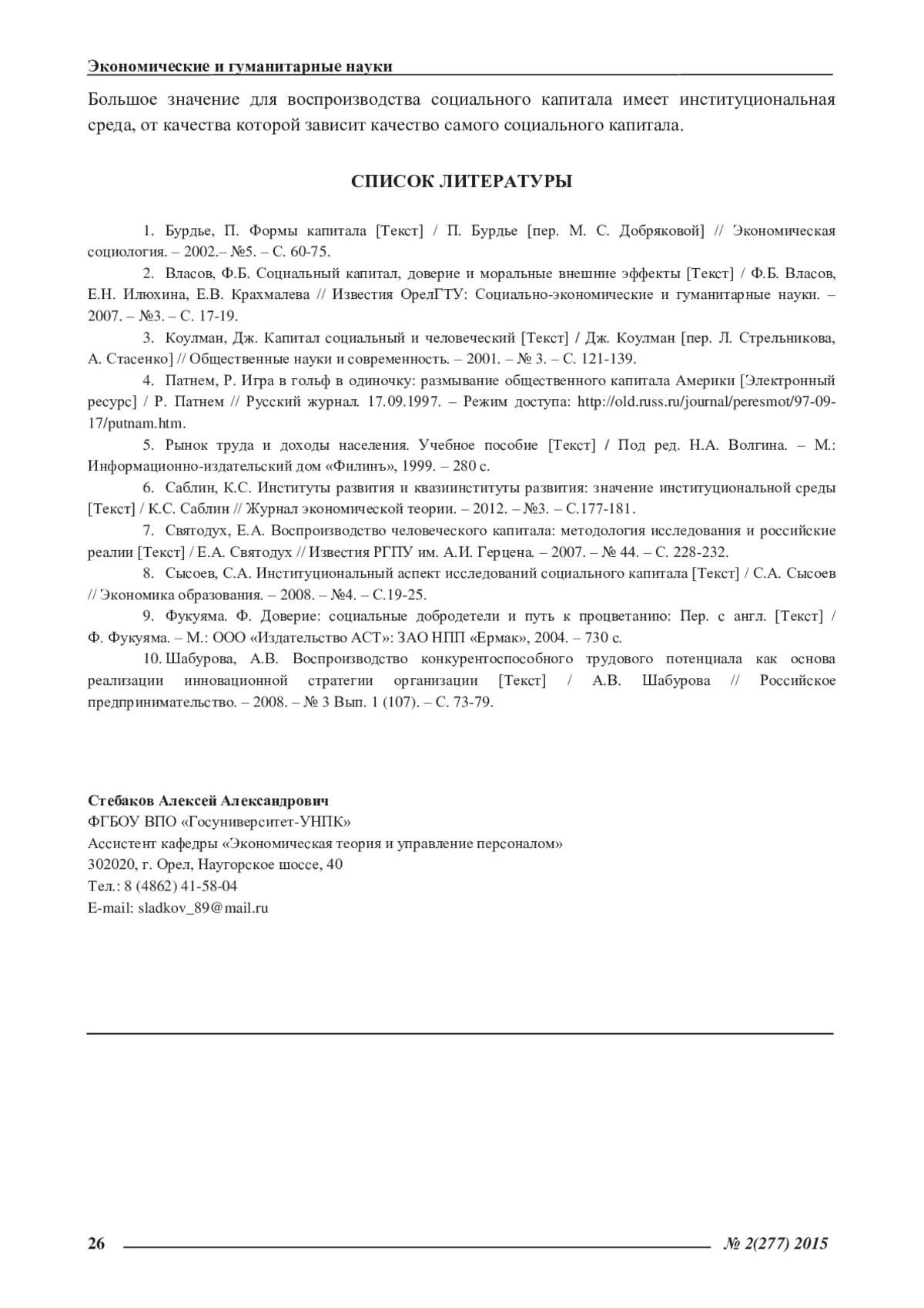 8. Сысоев, С.А. Институциональный аспект исследований социального капитала /С.А. Сысоев//Экономика образования. -2008. -№4. -С.19-25.