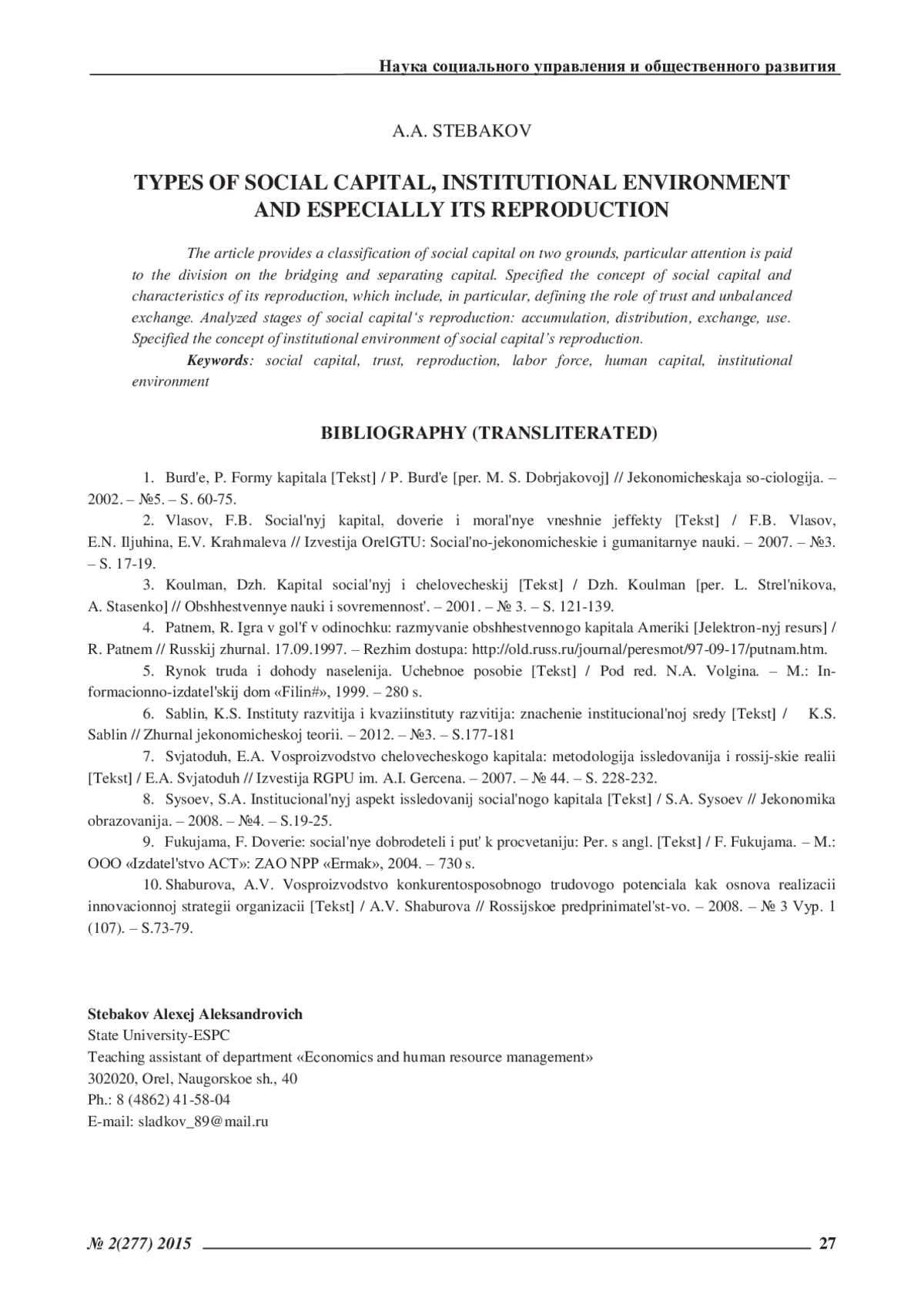 1. Бурдье, П. Формы капитала /П. Бурдье //Экономическая социология. -2002.-№5. -С. 60-75. EDN: OYUVRD