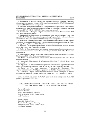 В статье представлена выборка художественных произведений начала ХХI в., соответствующих основным характеристикам жанра фантастической школьной повести о «попаданцах» в советское прошлое и позволяющих анализировать разные аспекты памяти у авторов и «постпамяти» (М. Хирш) у юных персонажей произведений. Способами проявления авторской культурно-исторической памяти в повестях Т. Крюковой, А. Жвалевского, Е. Пастернак, А. Ремиз являются речевые особенности персонажей, в том числе использование советизмов, эмоциональная модальность освещения социальных правил поведения, принятых в советском обществе 1980-х гг., характеристика материально-технической культуры (одежда, вещи, средства связи и пр.), социальных и геополитических контекстов. Анализ повестей позволил установить, что все авторы соединяют два принципа изображения эпох: контраст и параллелизм. На контрасте высвечиваются стереотипы и особенности исторических периодов (1980-х и 2000-х гг.), различие детей современной России и Советского Союза. Параллелизм же связан с проявлением в поведении персонажей вечных гуманистических ценностей (дружба, сострадание, взаимовыручка, справедливость), которые сохраняются в разных исторических и социокультурных контекстах и составляют опору для выстраивания отношений и самоопределения персонажей-подростков.