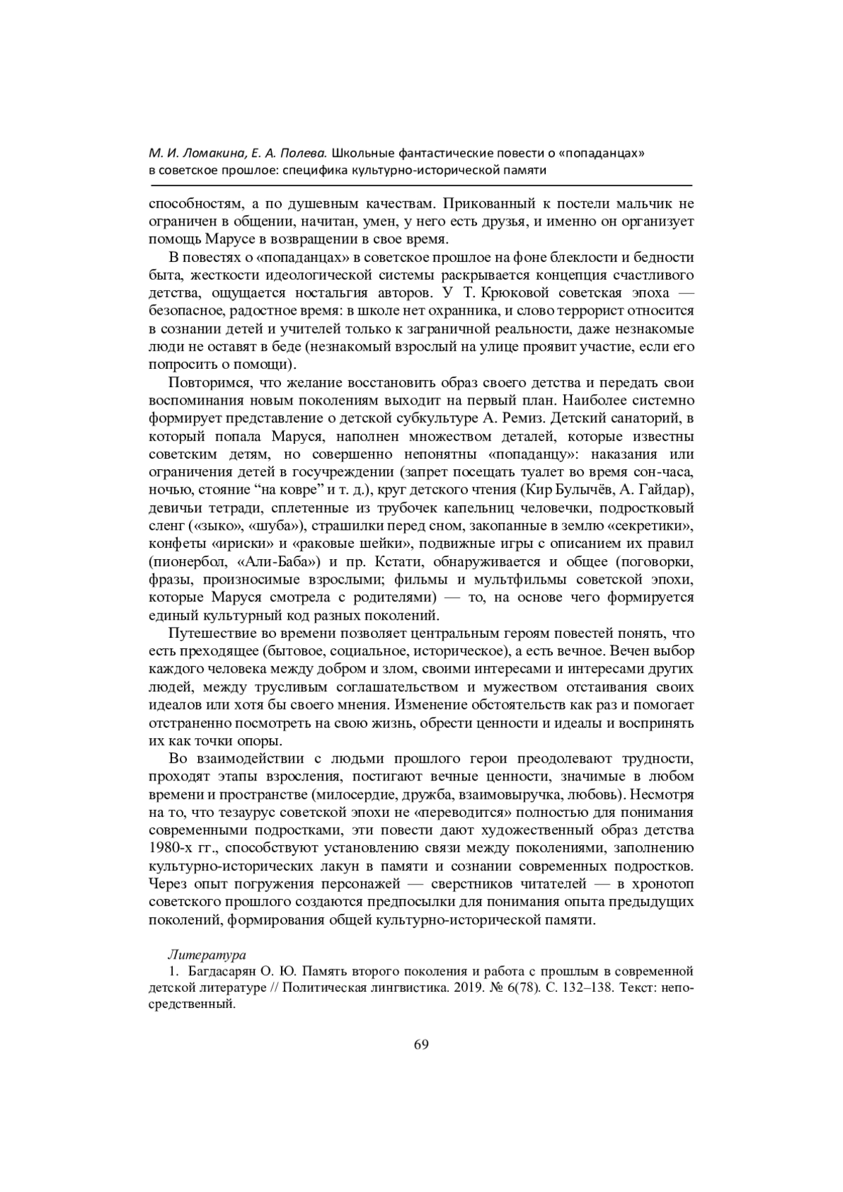 1. Багдасарян О. Ю. Память второго поколения и работа с прошлым в современной детской литературе // Политическая лингвистика. 2019. № 6(78). С. 132-138. Текст: непосредственный. EDN: LEDXJL