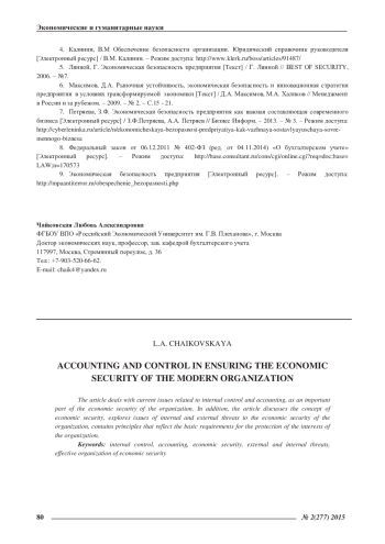 3. Вознесенская, Н.В. Роль организации бухгалтерского учета в обеспечении экономической безопасности предприятия /Н.В. Вознесенская, М.В. Львова//Экономика и управление: новые вызовы и перспективы. -2010. -№ 1. -С 250 -252. EDN: NBKIDJ
