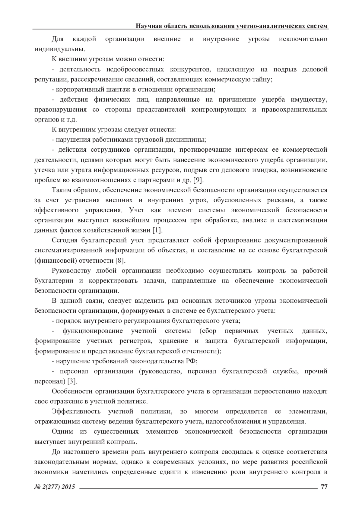 В статье раскрыты актуальные вопросы, связанные с внутренним контролем и бухгалтерским учетом, как важнейшими элементами системы экономической безопасности организации. Кроме того, в статье рассматривается понятие экономической безопасности, исследуются вопросы внутренних и внешних угроз экономической безопасности организации, содержатся принципы, отражающие основные требования по защите интересов организации