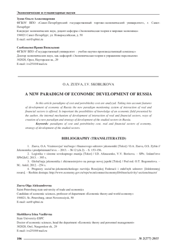 1. Зуева, О.А. Взаимосвязь реального и финансового секторов экономики [Текст] / О.А. Зуева, О.С. Зыбин // Экономика и предпринимательство. - 2013. - № 12 (ч.2). - С. 153-156. EDN: RQBKMX