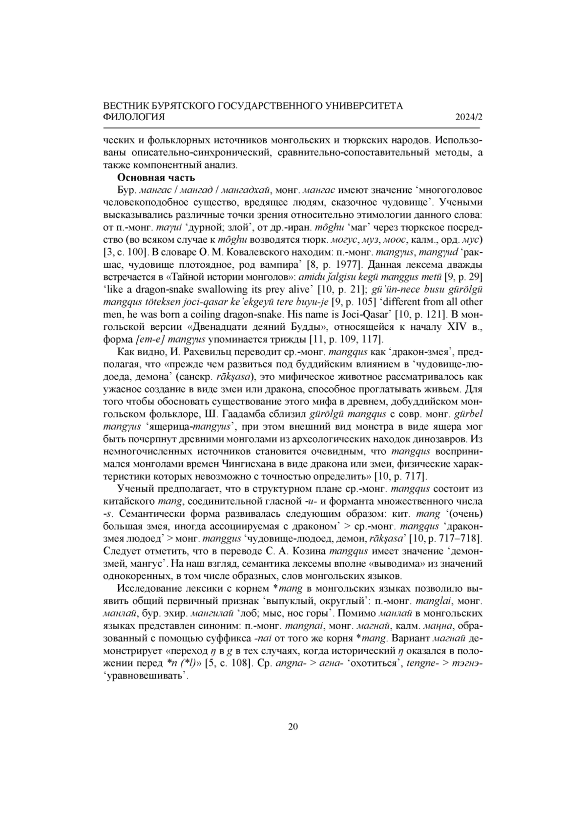 В данной работе предпринята попытка выявить внутреннюю форму слова mangyus, обозначающего основного отрицательного персонажа из фольклора монгольских народов в виде многоголового антропоморфного существа, противопоставляемого положительным эпическим героям. Использованы материалы лексикографических и фольклорных источников, также для сравнения привлекаются данные тюркских языков. На основе анализа семантики слов с корнем *mang (и его вариантов *mangq, *mant, *mand) автор устанавливает, что данный корень служил для реализации признаков ‘округлый’ → ‘большеголовый’ → ‘многоголовый’. Эти признаки в полной мере применимы к внешнему виду рассматриваемых фольклорных персонажей. Автор предполагает, что именно образная лексика является ключом к выявлению мотива номинации базовой лексики алтайских языков. Выявление общего для монгольских и тюркских языков мотива номинации ‘большеголовый’ отражает особенности национально -культурного мировидения родственных народов.
