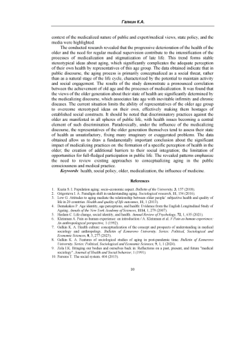 8. Галкин К. А. Особенности социологических исследований старения в постпандемийное время / К. А. Галкин // Вестник Кемеровского университета. Серия: Политические, социологические и экономические науки. - 2024. - №. 9 (1). - С. 1-10.