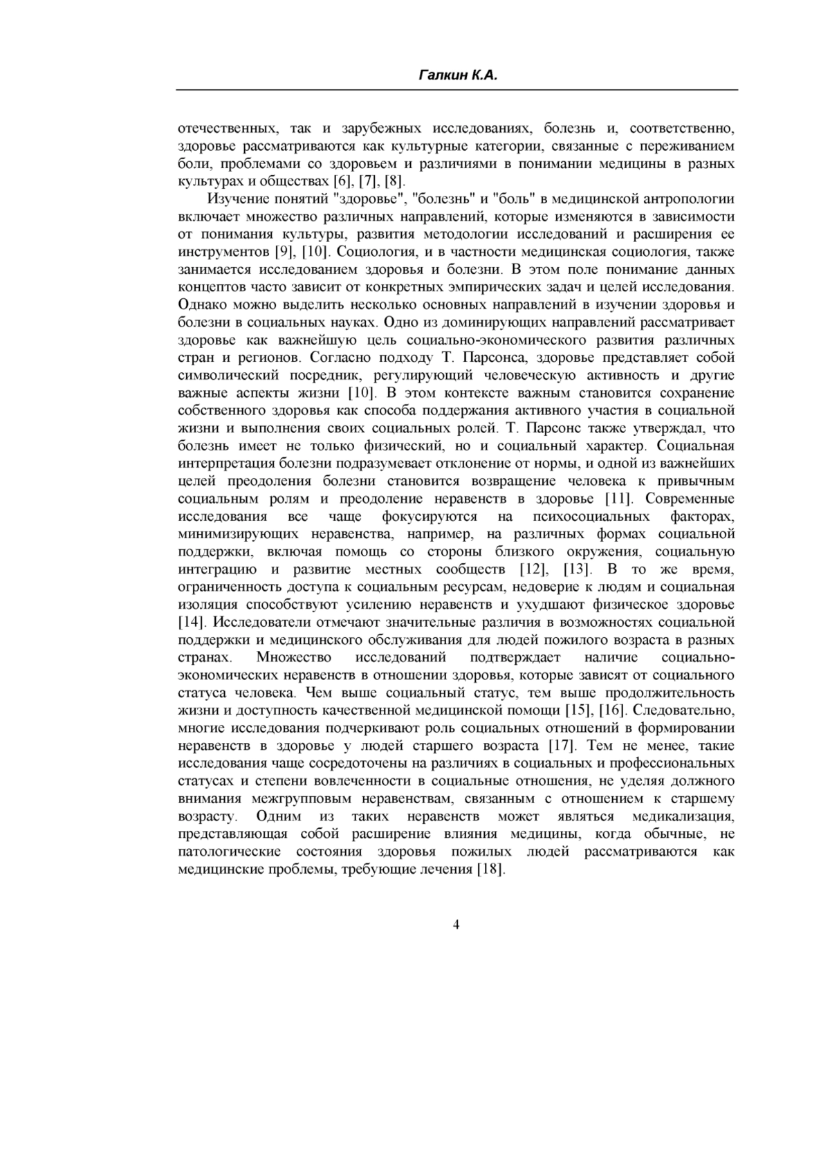 7. Галкин К. А. Культура здоровья: концептуализация понятия и перспективы осмысления в медицинской социологии и антропологии / К. А. Галкин // Вестник Кемеровского университета. Серия: Политические, социологические и экономические науки. - 2023. - №. 8 (3). - С. 277-283.