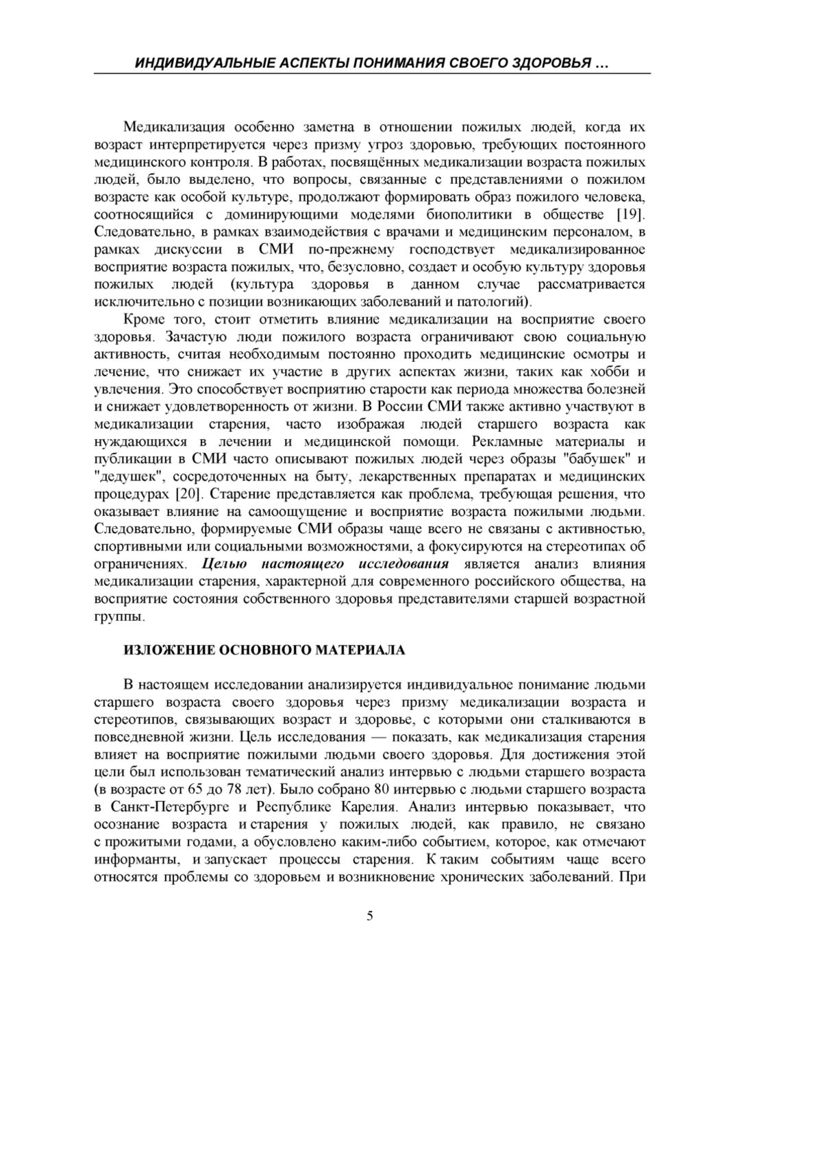 В настоящем исследовании анализируется влияние возраста, медикализирующего характера коммуникаций и средств массовой информации на восприятие собственного здоровья пожилыми людьми. Медикализация в этом контексте определяется как расширение влияния медицины, когда обычные, не патологические состояния здоровья пожилых людей рассматриваются как медицинские проблемы, требующие лечения. Целью настоящего исследования является анализ влияния медикализации старения, характерной для современного российского общества, на восприятие состояния собственного здоровья представителями старшей возрастной группы. Эмпирической базой исследования стали интервью с людьми старшего возраста, проживающими в Санкт-Петербурге и Республике Карелия. Всего проведено 80 интервью. На основе тематического анализа были выделены особенности восприятия собственного здоровья и осмысления старения в контексте медикализированного характера общественных и экспертных/медицинских взглядов, политики государства, СМИ.