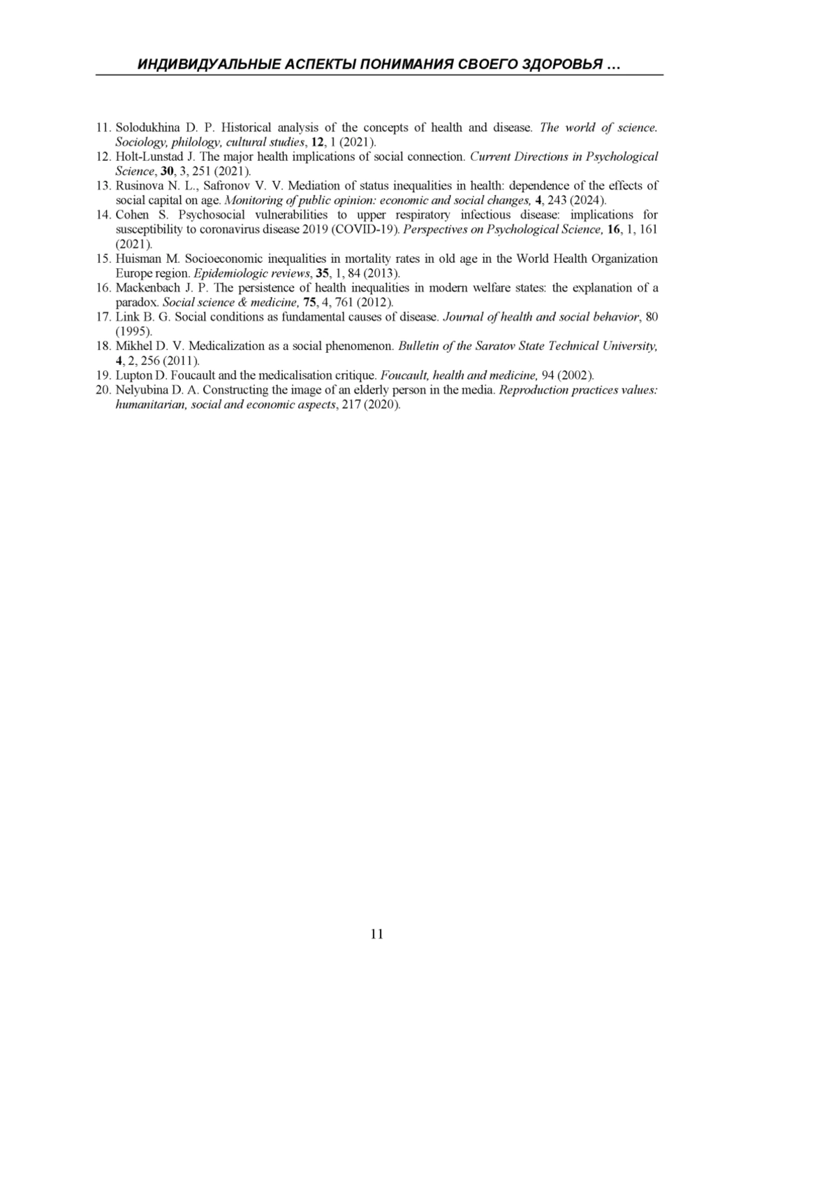 13. Русинова Н. Л., Сафронов В. В. Медиации статусных неравенств в здоровье: зависимость эффектов социального капитала от возраста / Н. Л. Русинова, В. В. Сафронов // Мониторинг общественного мнения: экономические и социальные перемены. - 2024. - №. 4. - С. 243-265. EDN: PDJPWT
