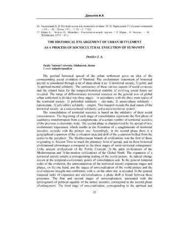 1. Данилов И. А. Территориальные уровни градостроительных систем как ступени социальной эволюции человечества / И. А. Данилов // Новые идеи нового века. - 2007. - С. 72-76.