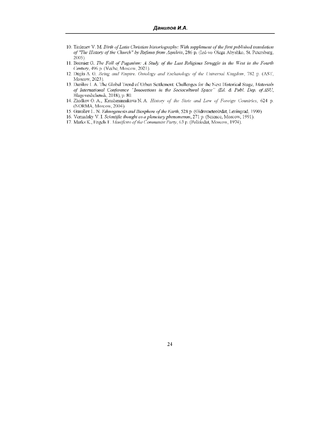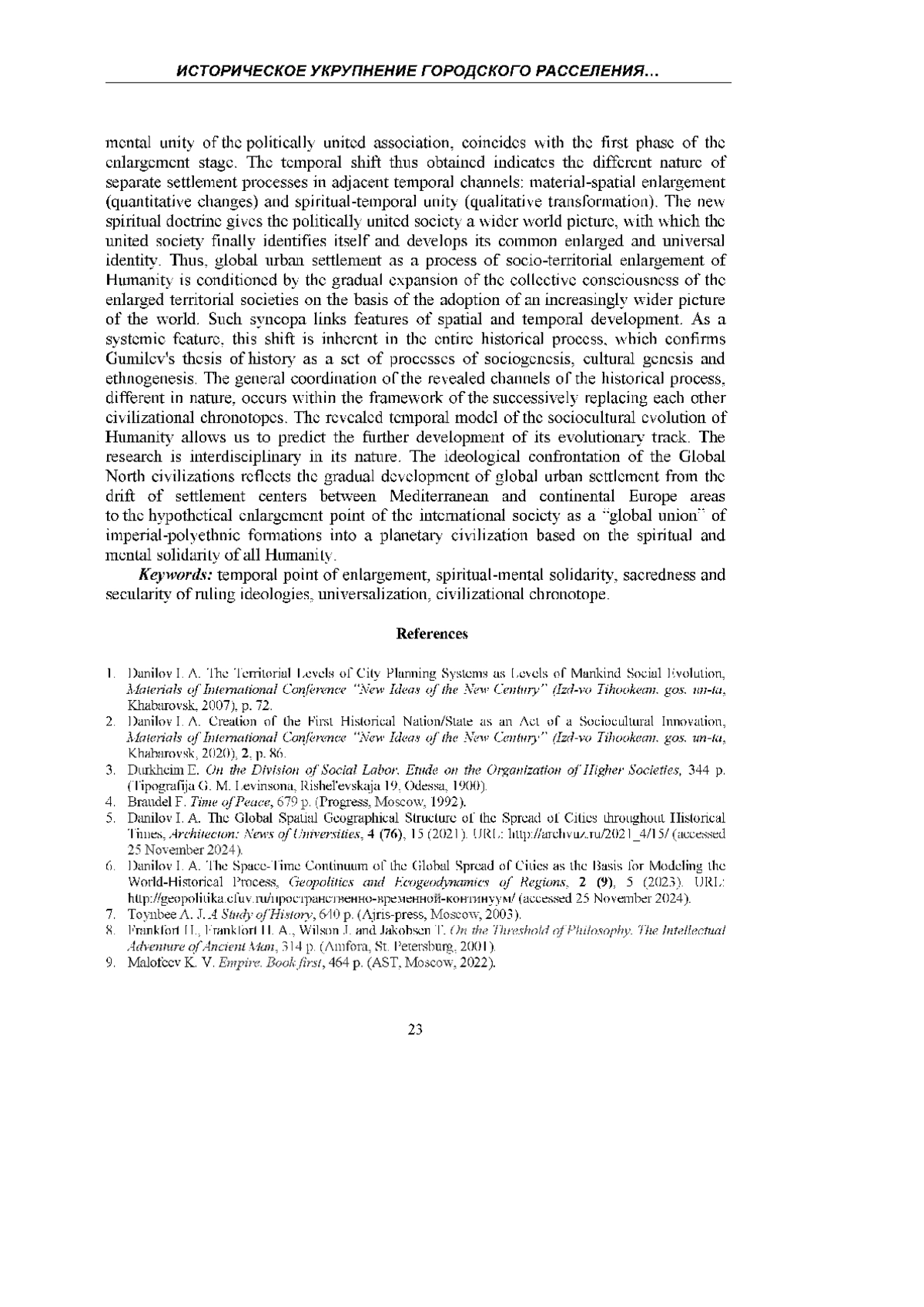 6. Данилов И. А. Пространственно-временной континуум глобального городского расселения как основа моделирования всемирно-исторического процесса / И. А. Данилов // Геополитика и экогеодинамика регионов. [Электронный ресурс] - 2023. - Т. 9, № 2. - С. 5-18. URL: http://geopolitika.cfuv.ru/пространственно-временной-континуум/ (дата доступа: 25.11.2024). EDN: SAQJHV