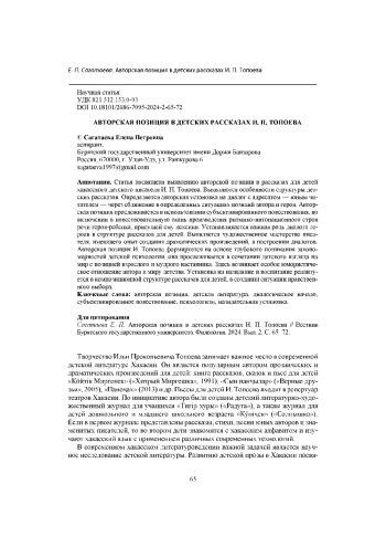 Статья посвящена выявлению авторской позиции в рассказах для детей хакасского детского писателя И. П. Топоева. Выявляются особенности структуры детских рассказов. Определяется авторская установка на диалог с адресатом - юным читателем - через сближение в определенных ситуациях позиций автора и героя. Авторская позиция прослеживается в использовании субъективированного повествования, во включении в повествовательную ткань произведения ритмико-интонационного строя речи героя-ребенка, присущей ему лексики. Устанавливается важная роль диалога героев в структуре рассказов для детей. Выявляется художественное мастерство писателя, имеющего опыт создания драматических произведений, в построении диалогов. Авторская позиция И. Топоева формируется на основе глубокого понимания закономерностей детской психологии, она прослеживается в сочетании детского взгляда на мир с позицией взрослого и мудрого наставника. Здесь возникает особое юмористическое отношение автора к миру детства. Установка на назидание и воспитание реализуется в композиционной структуре рассказов для детей, в создании ситуации нравственного выбора.