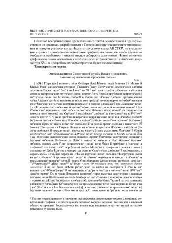 Создание полной картины формирования русского национального языка невозможно без привлечения региональных письменных источников XVII-XVIII вв., что настоятельно требует привлечения новых текстов и расширения исследовательской базы. В неисчислимом собрании памятников деловой письменности, хранящихся в центральных и региональных российских архивах, особое внимание привлекают документы XVII в., составленные на территории Сибири, в частности за Байкалом. Их отличительными чертами являются не только своеобразная лингвистическая содержательность, но и сама история их происхождения в контексте географических, этнографических, климатических реалий, что необходимо учитывать исследователям при анализе языка сибирских деловых бумаг XVII в