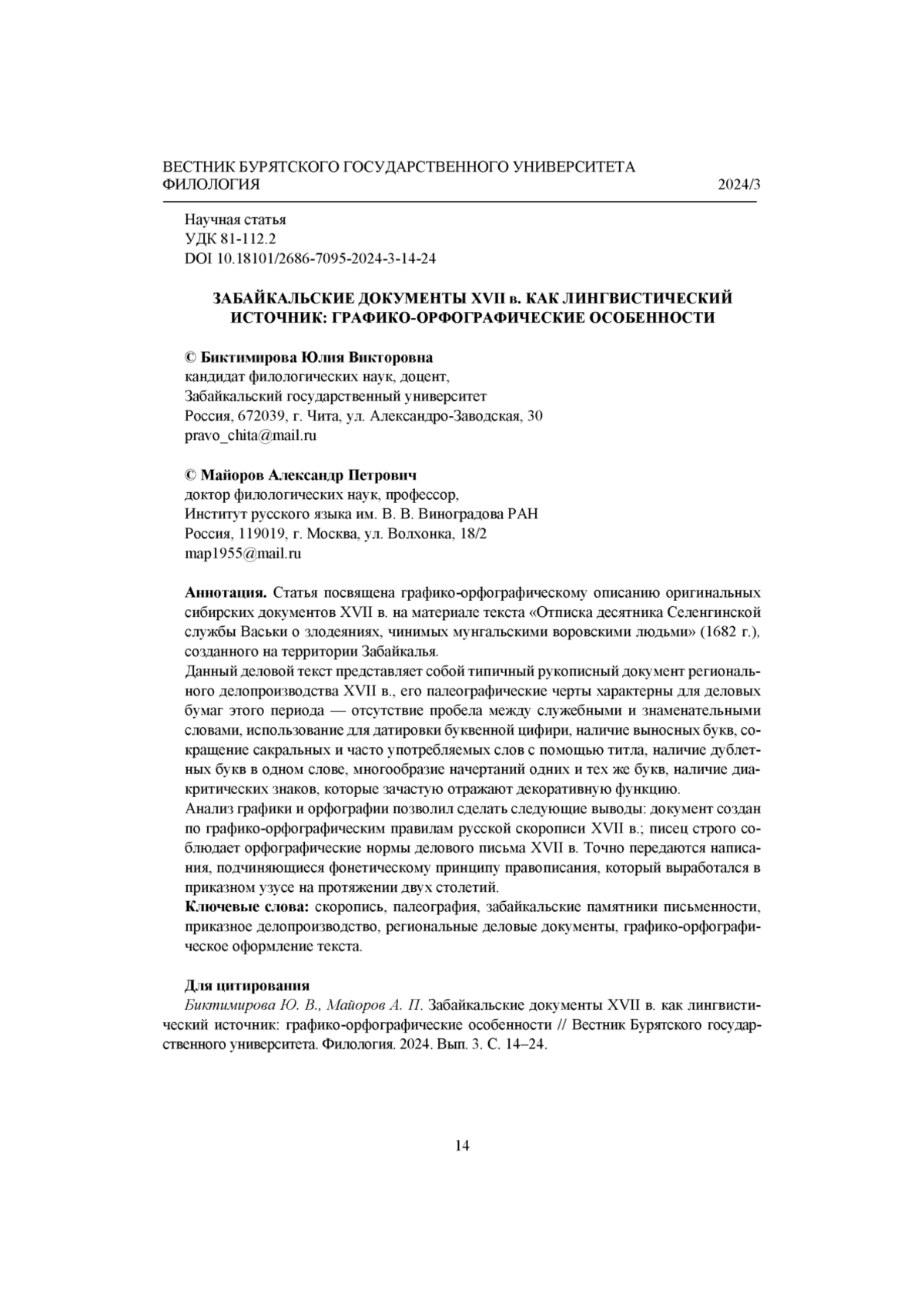 Статья посвящена графико-орфографическому описанию оригинальных сибирских документов XVII в. на материале текста «Отписка десятника Селенгинской службы Васьки о злодеяниях, чинимых мунгальскими воровскими людьми» (1682 г.), созданного на территории Забайкалья. Данный деловой текст представляет собой типичный рукописный документ регионального делопроизводства XVII в., его палеографические черты характерны для деловых бумаг этого периода - отсутствие пробела между служебными и знаменательными словами, использование для датировки буквенной цифири, наличие выносных букв, сокращение сакральных и часто употребляемых слов с помощью титла, наличие дублетных букв в одном слове, многообразие начертаний одних и тех же букв, наличие диакритических знаков, которые зачастую отражают декоративную функцию. Анализ графики и орфографии позволил сделать следующие выводы: документ создан по графико-орфографическим правилам русской скорописи XVII в.; писец строго соблюдает орфографические нормы делового письма XVII в. Точно передаются написания, подчиняющиеся фонетическому принципу правописания, который выработался в приказном узусе на протяжении двух столетий.