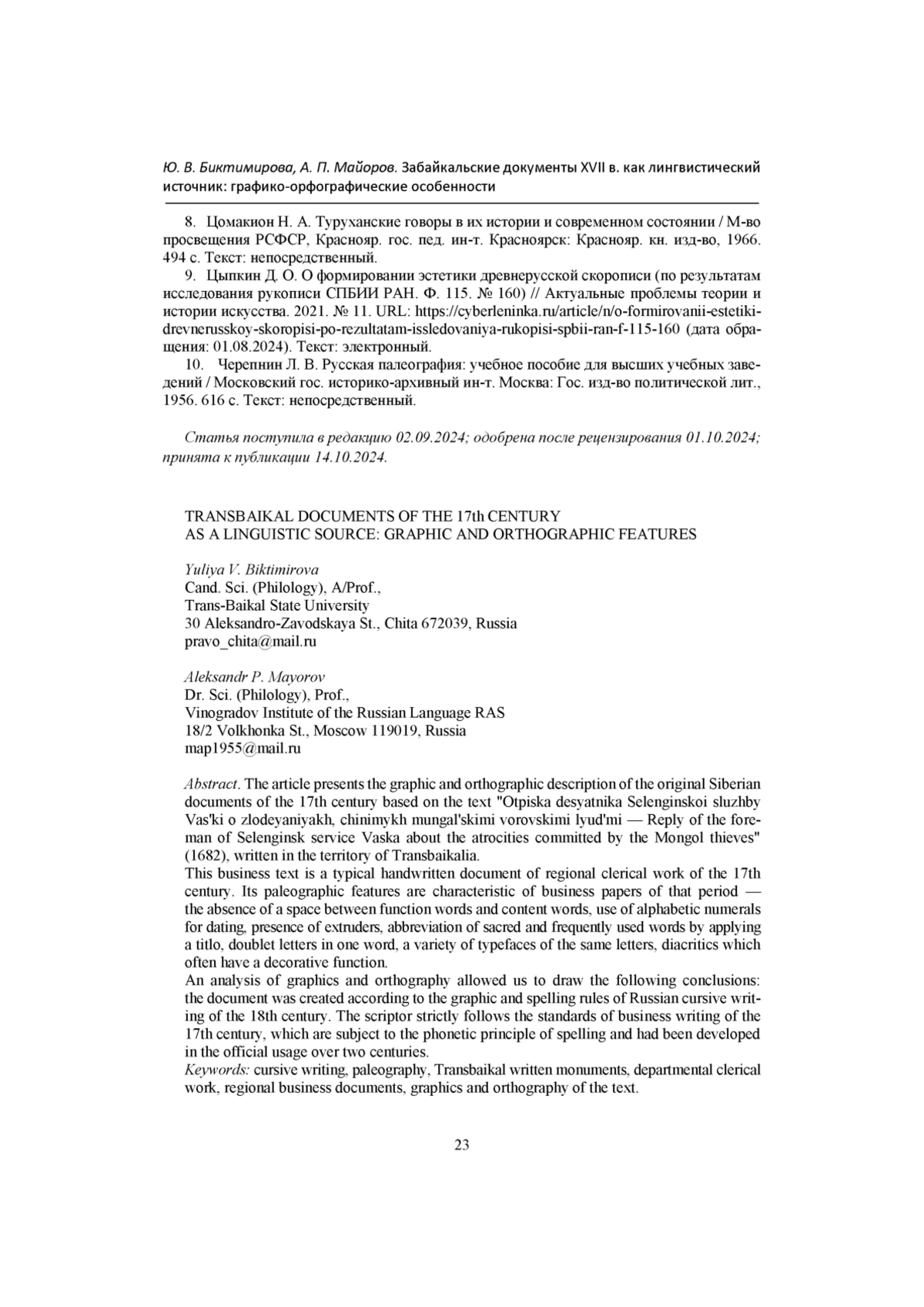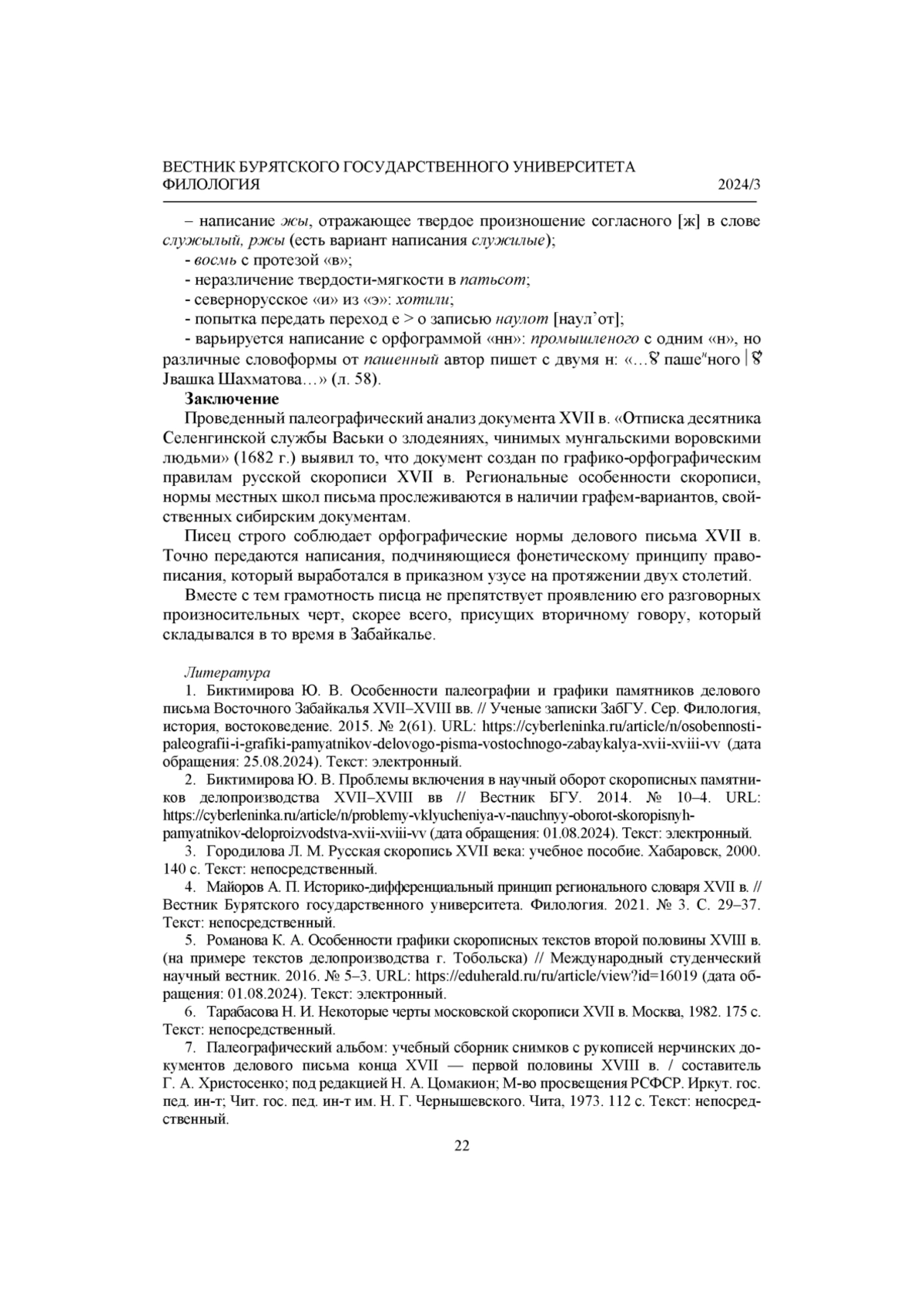 1. Биктимирова Ю. В. Особенности палеографии и графики памятников делового письма Восточного Забайкалья XVII-XVIII вв. // Ученые записки ЗабГУ. Сер. Филология, история, востоковедение. 2015. № 2(61). URL: https://cyberleninka.ru/article/n/osobennosti-paleografii-i-grafiki-pamyatnikov-delovogo-pisma-vostochnogo-zabaykalya-xvii-xviii-w (дата обращения: 25.08.2024). Текст: электронный.