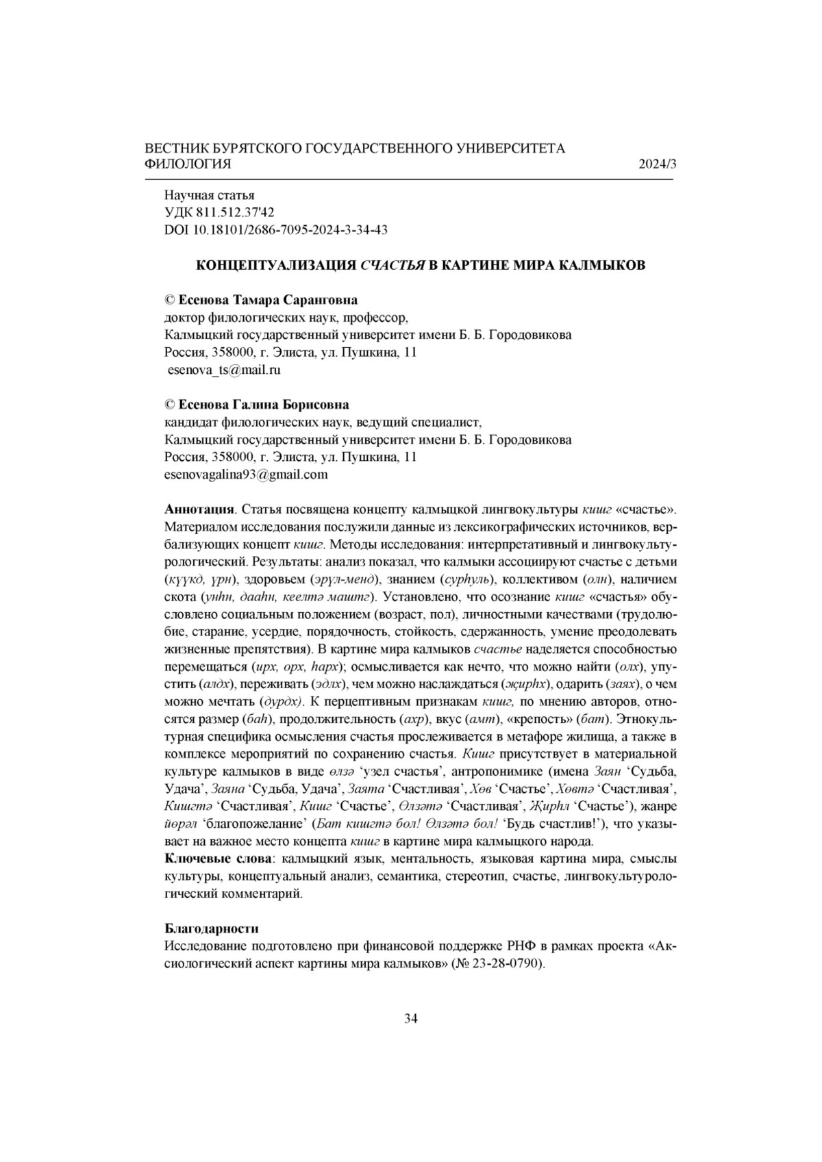 4. Есенова Т. С. Концепт “счастье” в менталитете калмыков // Народы Калмыкии: проблемы национальной идентичности и менталитета / ответственный редактор А. Н. Овшинов. Элиста: КалмГУ, КТИ (филиал) ПГТУ, 2005. С. 66-73. Текст: непосредственный. EDN: VVLLCN
