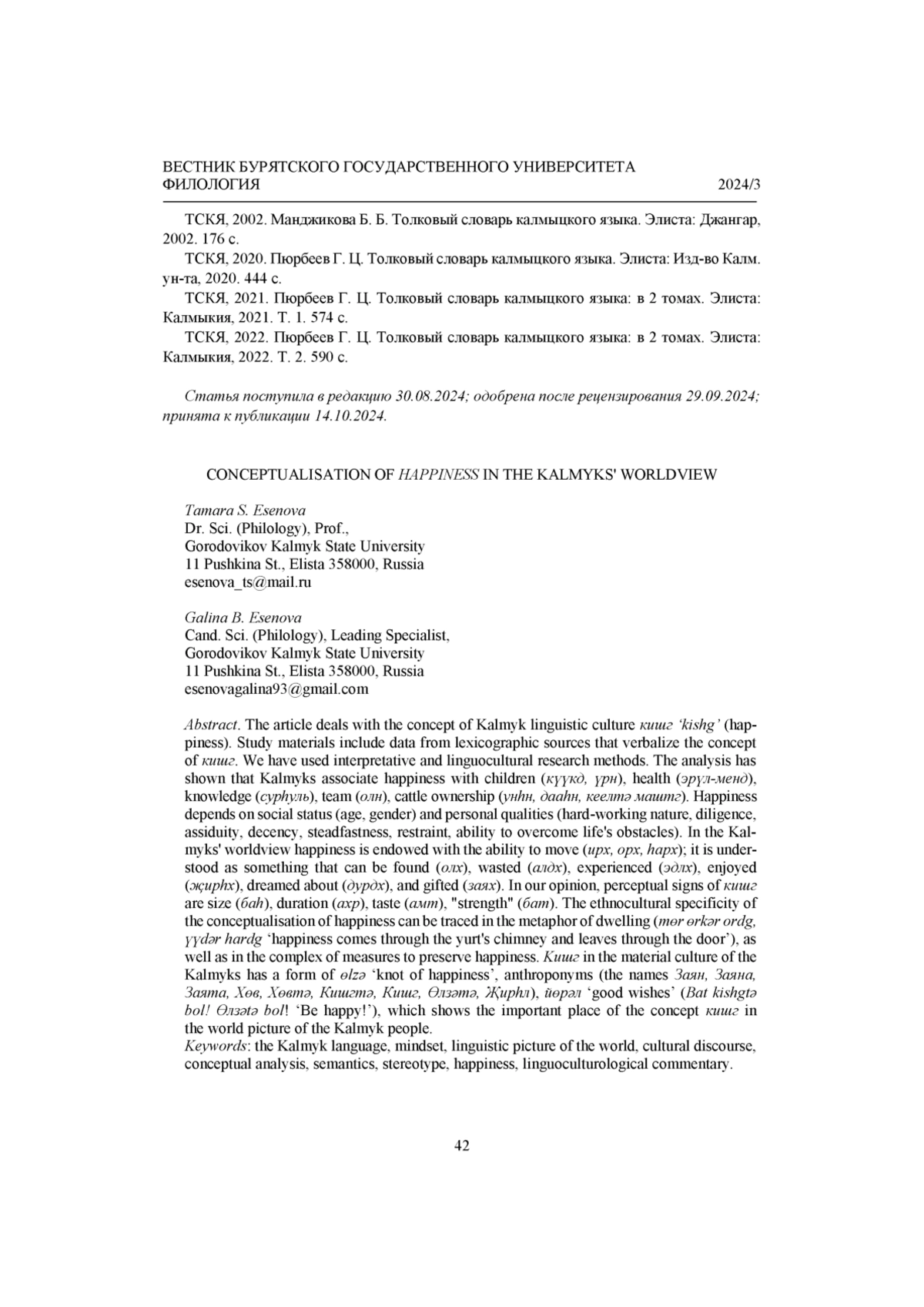2. Басангова Т. Г. Концепт “счастье” в обрядовом фольклоре калмыков // Этнокультурная концептология / ответственный редактор В. И. Карасик. Элиста: Изд-во Калм. ун-та, 2006. С. 42-44. Текст: непосредственный.