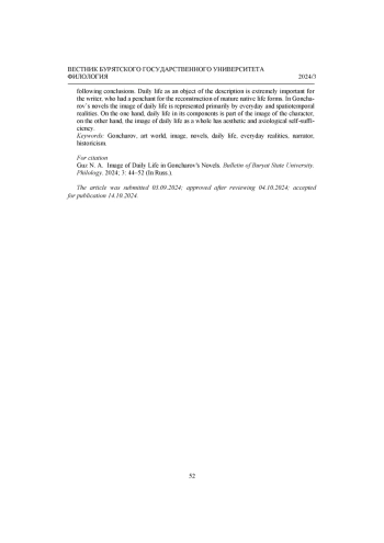 Автор ставит целью рассмотреть образ повседневности в художественном мире И. А. Гончарова. Феномен повседневности рассматривается как часть оппозиций: «быт - бытие», «вещное - духовное» и др. Анализу предшествует краткий экскурс в историю научного исследования этого феномена представителями философии, социологии, литературоведения, что позволяет констатировать широту диапазона различных подходов и отсутствие универсальной формулировки понятия. В работе использовались культурно-исторический, семиотический, типологический методы. Результатом исследования стали следующие выводы. В романах И. А. Гончарова образ повседневности представлен прежде всего бытовыми, а также пространственно-временными реалиями. Поэтика повседневности является базовым компонентом создания образов в художественном мире И. А. Гончарова. Образ повседневности в романах писателя обладает самодостаточностью, культурно-исторической и эстетической ценностью, его структурные элементы служат задачам создания образов героев, психологизации повествования, установлению идейно-эстетического замысла автора.