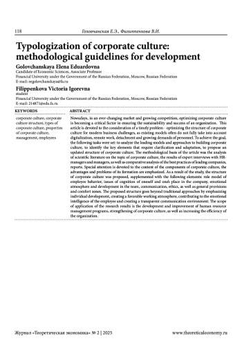 На сегодняшний день, в условиях постоянно изменяющегося рынка и растущей конкуренции, оптимизация корпоративной культуры становится критически важным фактором для обеспечения устойчивости и успеха организации. Данная статья посвящена рассмотрению актуальной проблемы - оптимизация структуры корпоративной культуры под современные вызовы бизнеса, поскольку существующие модели часто не в полной мере учитывают цифровизацию, удаленную работу, оторванность и растущие требования персонала. Для достижения цели были поставлены следующие задачи: проанализировать ведущие модели и подходы к построению корпоративной культуры, выделить ключевые элементы, требующие уточнения и адаптации, предложить обновленную структуру корпоративной культуры. Методологической основой статьи послужил анализ научной литературы по теме корпоративной культуры, результаты экспертных интервью с HR-менеджерами и руководителями, а также сравнительный анализ лучших практик ведущих компаний, отчеты. Уделяется особое внимание содержанию составляющих корпоративной культуры, подчеркиваются преимущества и проблемы ее формирования. В результате исследования была предложена структура корпоративной культуры, дополненная следующими элементами: ролевая модель поведения сотрудника, вопросы познания себя и своего места в компании, эмоциональная атмосфера и развитие в коллективе, коммуникация, этика, а также общие положения и зоны комфорта. Предложенная структура выходит за рамки традиционных подходов, делая акцент на индивидуальном развитии, создании благоприятной рабочей атмосферы, вклад в эмоциональный интеллект сотрудника и создание прозрачной коммуникационной среды. Область применения результатов исследования - разработка и совершенствование программ управления персоналом, укрепление корпоративной культуры, а также повышение эффективности деятельности организации.