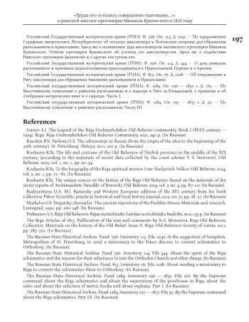 5. Кожурин К.Я. Уникальный источник по истории рижского старообрядчества (по материалам секретных донесений боровского архимандрита Венедикта) // Старообрядчество. 2024. Т. 2. № 4. С. 87-117.