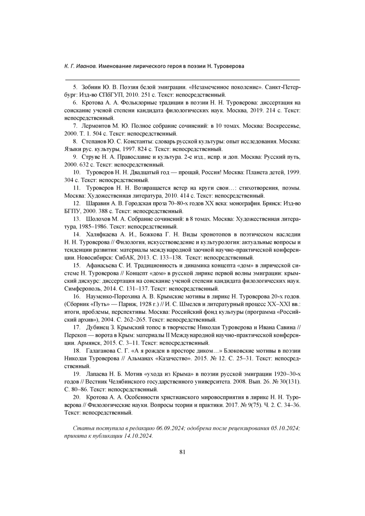 6. Кротова А. А. Фольклорные традиции в поэзии Н. Н. Туроверова: диссертация на соискание ученой степени кандидата филологических наук. Москва, 2019. 214 с. Текст: непосредственный. EDN: EVIEJF