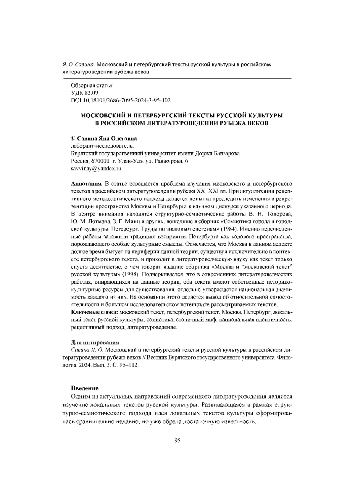 В статье освещается проблема изучения московского и петербургского текстов в российском литературоведении рубежа XX-XXI вв. При актуализации рецептивного методологического подхода делается попытка проследить изменения в репрезентации пространства Москвы и Петербурга в научном дискурсе указанного периода. В центре внимания находятся структурно-семиотические работы В. Н. Топорова, Ю. М. Лотмана, З. Г. Минц и других, вошедшие в сборник «Семиотика города и городской культуры. Петербург. Труды по знаковым системам» (1984). Именно перечисленные работы заложили традицию восприятия Петербурга как кодового пространства, порождающего особые культурные смыслы. Отмечается, что Москва в данном аспекте долгое время бытует на периферии данной теории, существуя исключительно в контексте петербургского текста, и приходит в литературоведческую науку как текст только спустя десятилетие, о чем говорит издание сборника «Москва и “московский текст” русской культуры» (1998). Подчеркивается, что в современных литературоведческих работах, опирающихся на данные теории, оба текста имеют собственные историкокультурные ресурсы для существования, отдельно утверждается национальная значимость каждого из них. На основании этого делается вывод об относительной самостоятельности и большом исследовательском потенциале рассматриваемых текстов.
