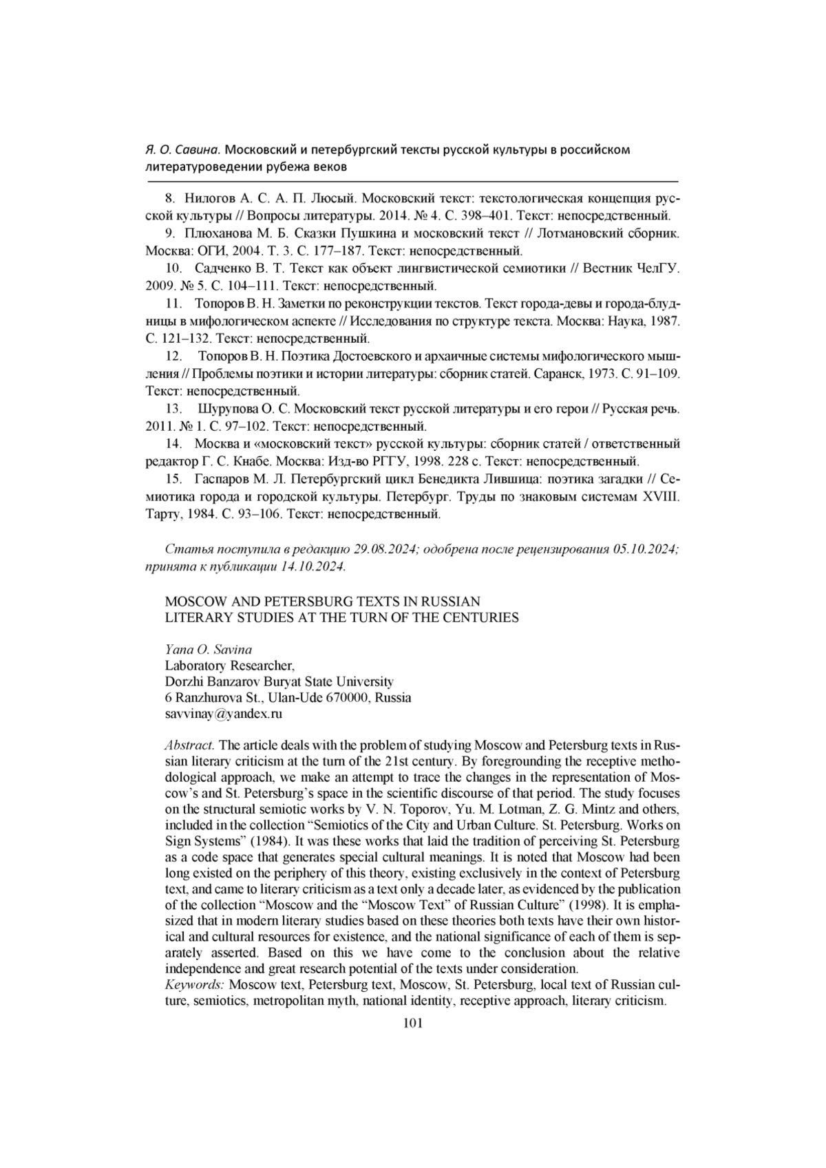 8. Нилогов А. С. А. П. Люсый. Московский текст: текстологическая концепция русской культуры // Вопросы литературы. 2014. № 4. С. 398-401. Текст: непосредственный. EDN: TXLKMJ
