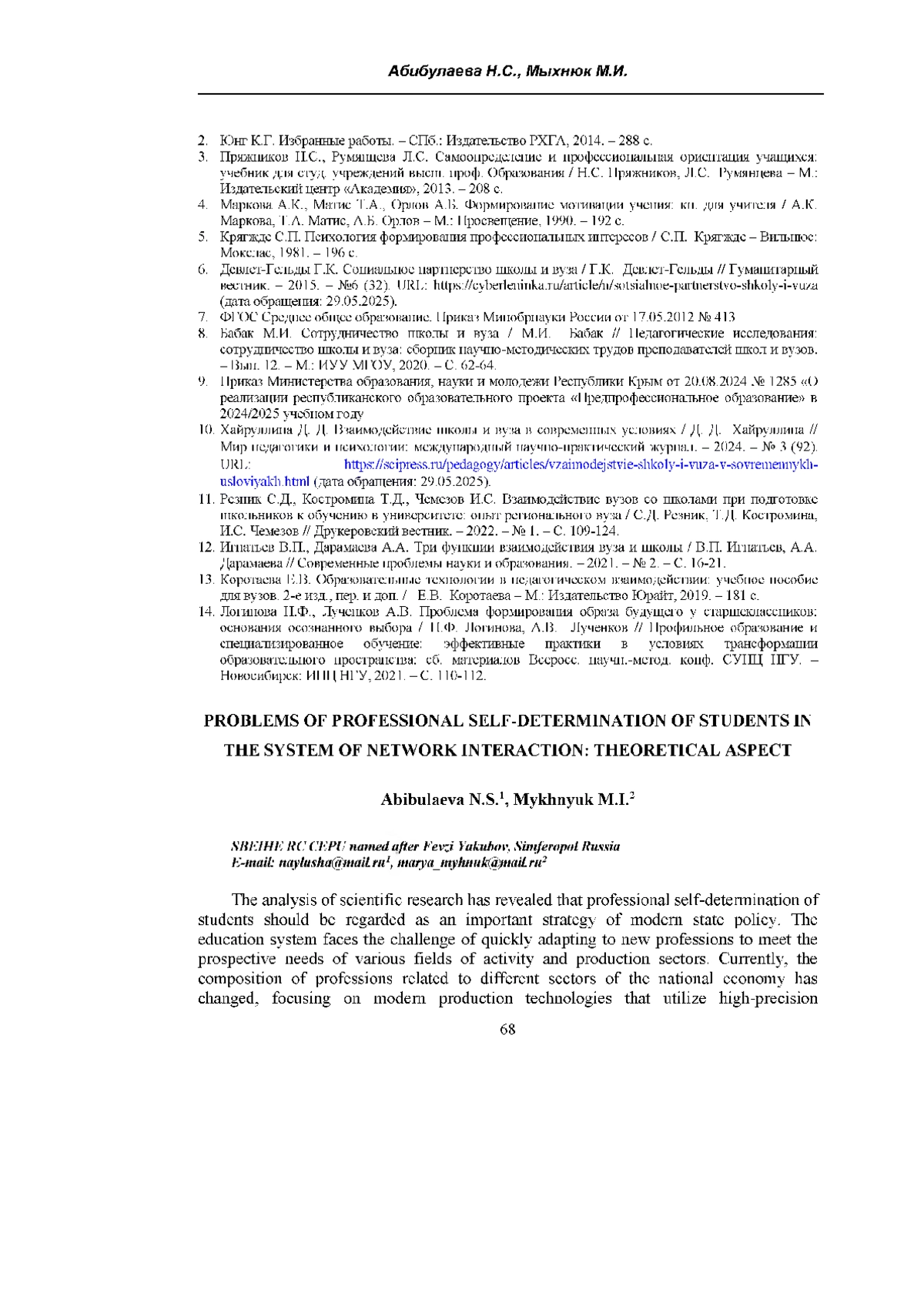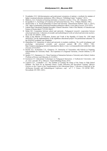 10. Хайруллина Д. Д. Взаимодействие школы и вуза в современных условиях / Д. Д. Хайруллина // Мир педагогики и психологии: международный научно-практический журнал. - 2024. - № 3 (92). URL: https://scipress.ru/pedagogy/articles/vzaimodejstvie-shkoly-i-vuza-v-sovremennykh-usloviyakh.html (дата обращения: 29.05.2025).
