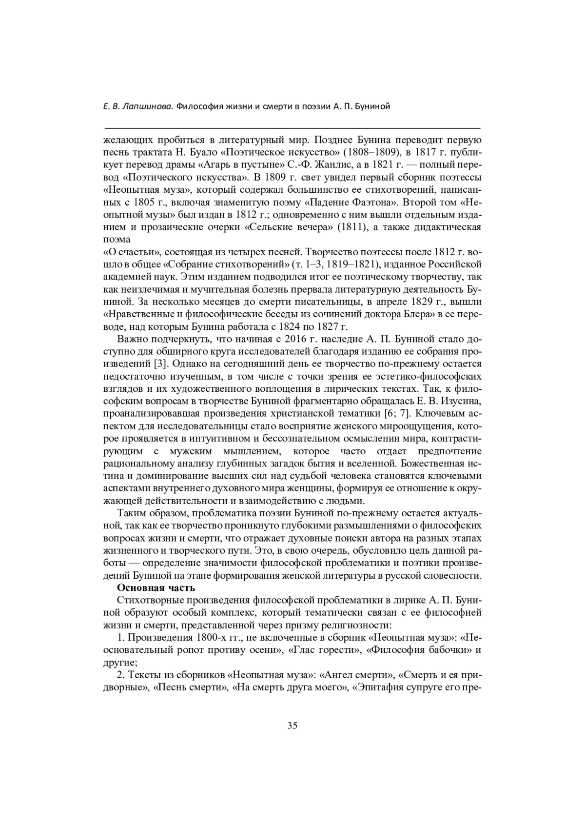 Статья посвящена философской проблематике в творчестве А. П. Буниной, признанной основоположницы женской лирики в русской литературе. Предметом исследования является философия жизни и смерти в ее поэзии в разные периоды творческого пути. В ходе анализа автор статьи приходит к выводу, что темы смысла жизни, неотвратимости конца определенным образом связаны у писательницы с влиянием религии и власти Бога над человеком и являются одними из ведущих в ее творчестве. В результате проведенного исследования расширено представление о тематическом диапазоне философской лирики Буниной. Вопросы бытия, смысла существования, любви, потери и смерти составляют мотивно-тематический комплекс, который раскрывается через уникальную призму женского восприятия. Значимость данного исследования в выбранной области продиктована не только ценностью фактов, касающихся изучения художественного мышления и восприятия мира Буниной, но и тем, что личный познавательный опыт женщины-писателя становится важной составляющей общего опыта осознания окружающей действительности.