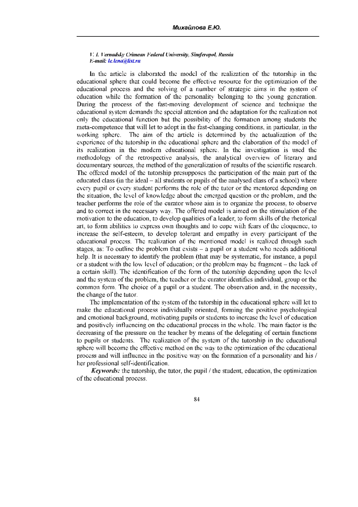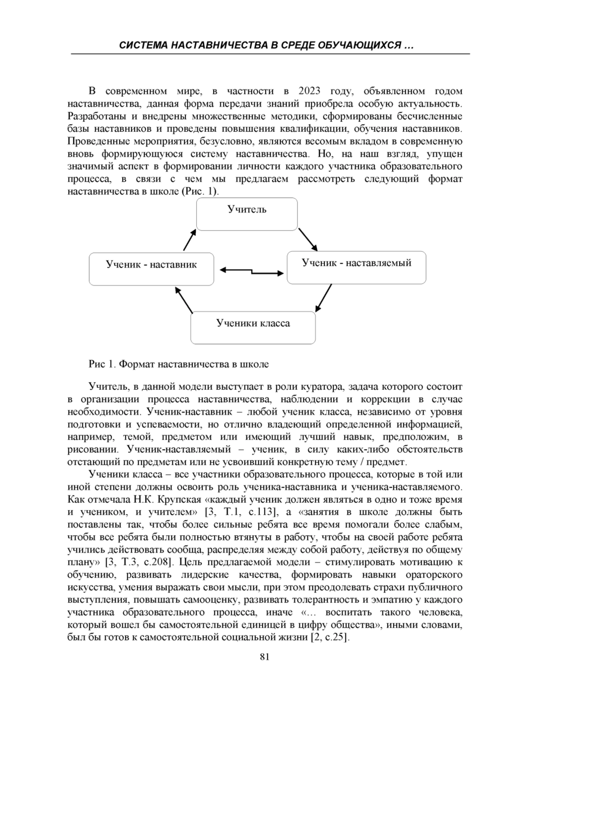 В статье предлагается модель реализации наставничества в среде обучающихся. В современном педагогическом пространстве актуализация системы наставничества станет эффективным ресурсом для оптимизации образовательного процесса и решения ряда стратегических задач в системе образования и формирования личности молодого поколения.