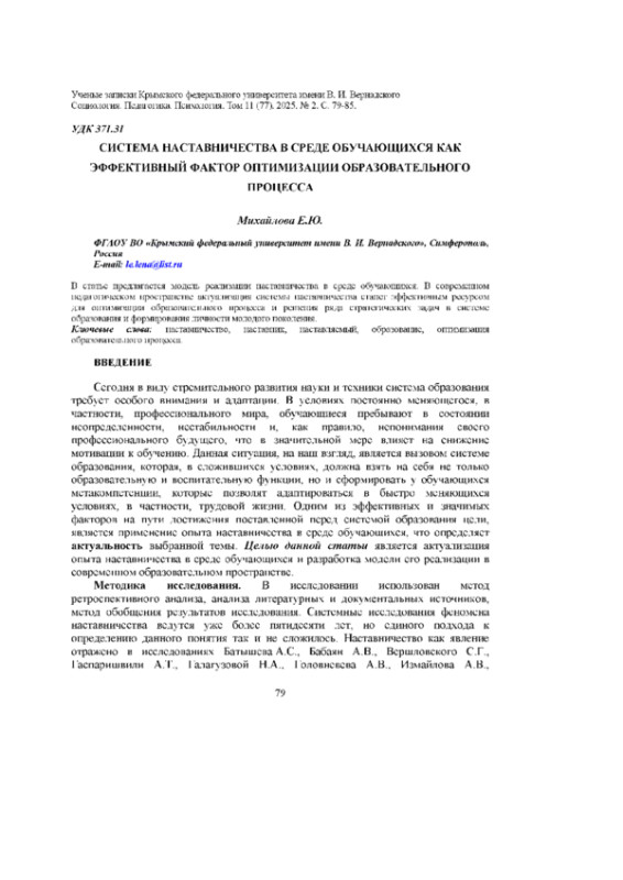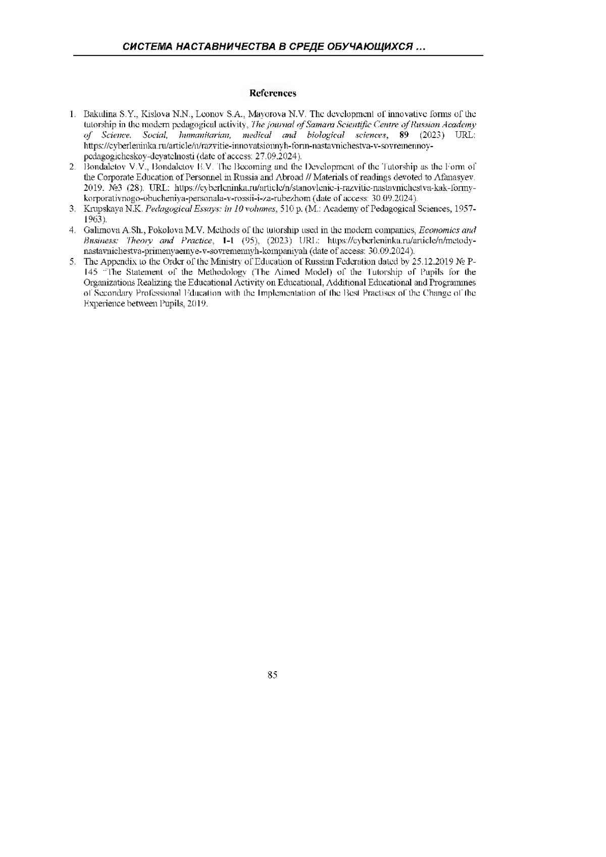 1. Бакулина С.Ю., Кислова Н.Н., Леонов С.А., Майорова Н.В. Развитие инновационных форм наставничества в современной педагогической деятельности / С.Ю. Бакулина, Н.Н. Кислова, С.А. Леонов, Н.В. Майорова // Известия Самарского научного центра Российской академии наук. Социальные, гуманитарные, медико-биологические науки. - 2023. - №89. URL: https://cyberleninka.ru/article/n/razvitie-innovatsionnyh-form-nastavnichestva-v-sovremennoy-pedagogicheskoy-deyatelnosti (дата обращения: 27.09.2024). EDN: DWRXPG