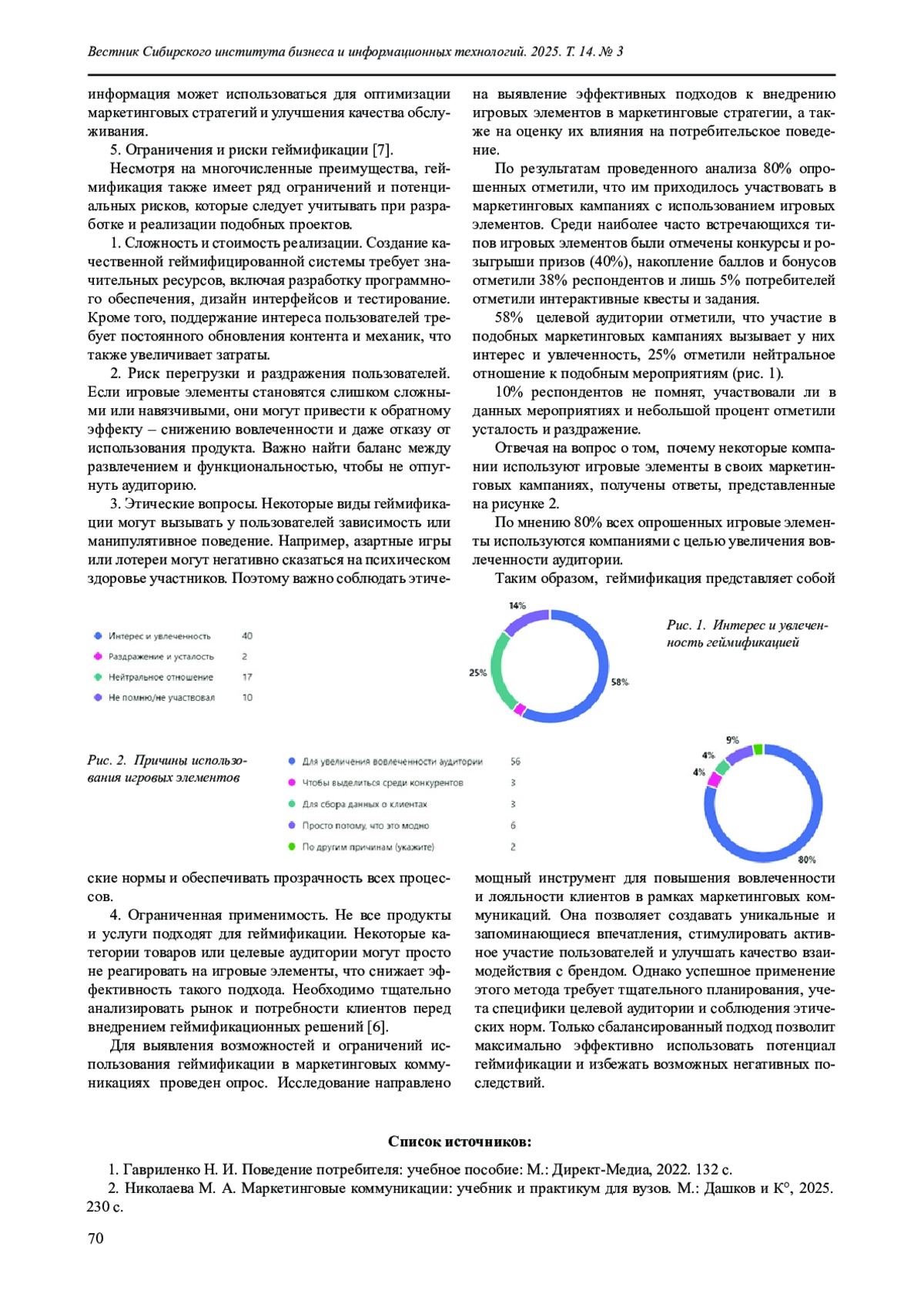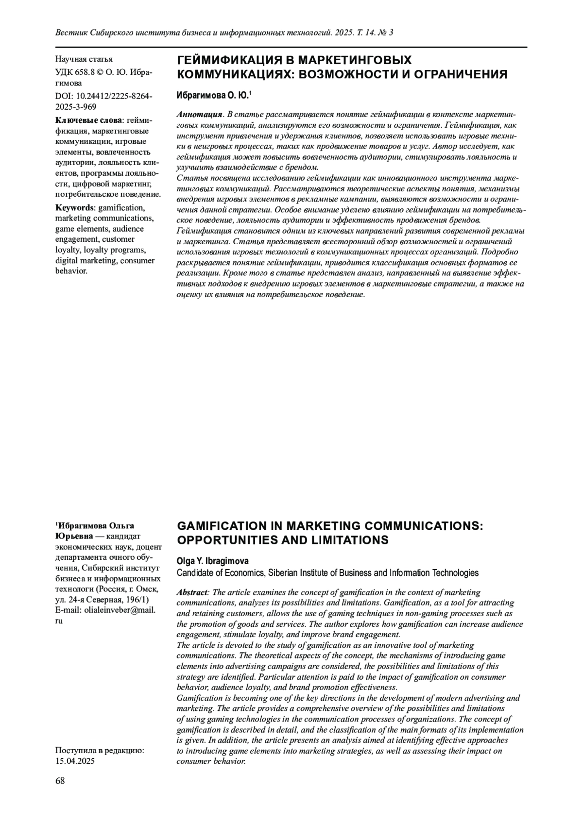 ИБРАГИМОВА О. Ю. ГЕЙМИФИКАЦИЯ В МАРКЕТИНГОВЫХ КОММУНИКАЦИЯХ: ВОЗМОЖНОСТИ И ОГРАНИЧЕНИЯ // ВЕСТНИК СИБИРСКОГО ИНСТИТУТА БИЗНЕСА И ИНФОРМАЦИОННЫХ ТЕХНОЛОГИЙ. 2025. ТОМ 14, № 3