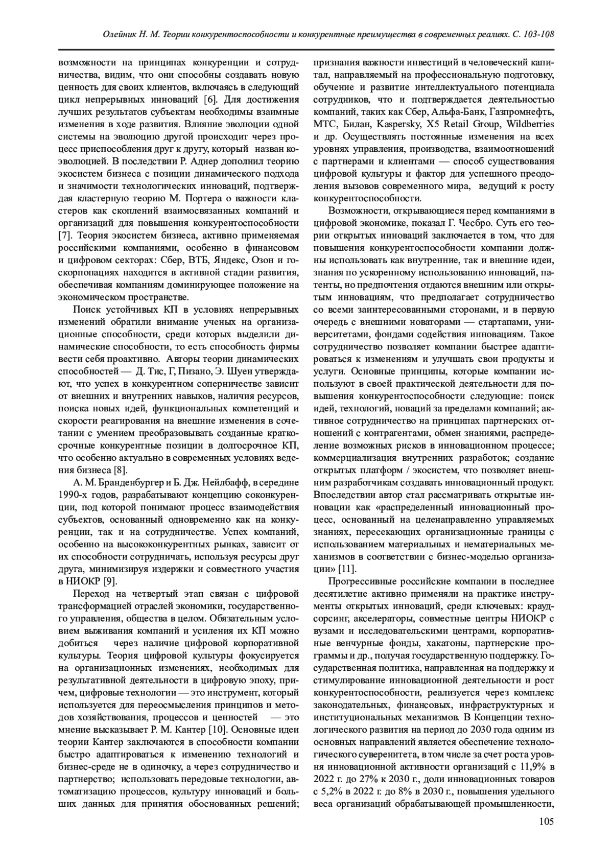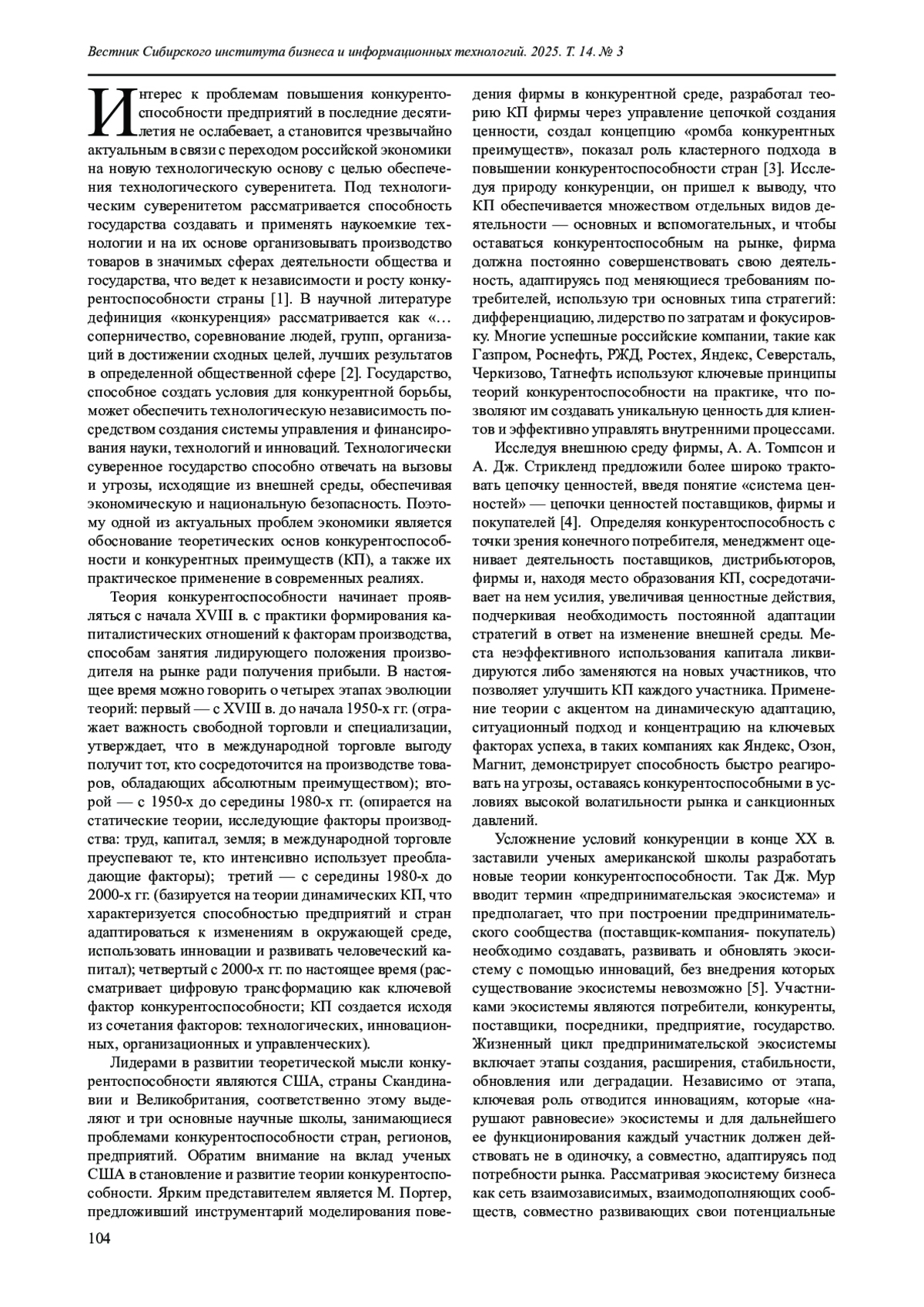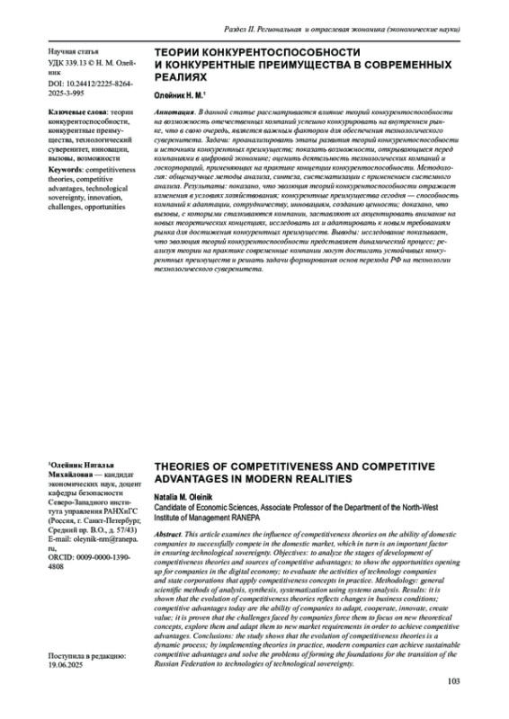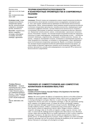 В данной статье рассматривается влияние теорий конкурентоспособности на возможность отечественных компаний успешно конкурировать на внутреннем рынке, что в свою очередь, является важным фактором для обеспечения технологического суверенитета. Задачи: проанализировать этапы развития теорий конкурентоспособности и источники конкурентных преимуществ; показать возможности, открывающиеся перед компаниями в цифровой экономике; оценить деятельность технологических компаний и госкорпораций, применяющих на практике концепции конкурентоспособности. Методология: общенаучные методы анализа, синтеза, систематизации с применением системного анализа. Результаты: показано, что эволюция теорий конкурентоспособности отражает изменения в условиях хозяйствования; конкурентные преимущества сегодня — способность компаний к адаптации, сотрудничеству, инновациям, созданию ценности; доказано, что вызовы, с которыми сталкиваются компании, заставляют их акцентировать внимание на новых теоретических концепциях, исследовать их и адаптировать к новым требованиям рынка для достижения конкурентных преимуществ. Выводы: исследование показывает, что эволюция теорий конкурентоспособности представляет динамический процесс; реализуя теории на практике современные компании могут достигать устойчивых конкурентных преимуществ и решать задачи формирования основ перехода РФ на технологии технологического суверенитета.