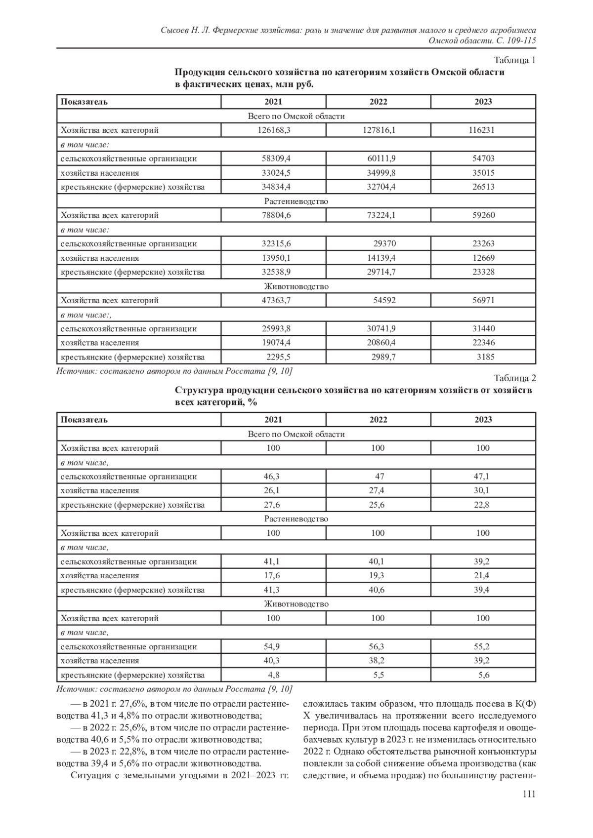 В статье исследуется значимость фермерских хозяйств для развития малого и среднего аграрного бизнеса Омской области. Сделан акцент на определение приоритета фермерских хозяйств как основной составляющей малого и среднего агробизнеса региона. Методологической базой проведенного исследования стали приемы статистики и экономического анализа. Определен удельный вес аграрной продукции в разрезе различных категорий хозяйств Омской области. За период с 2021 по 2023 год доля фермерской продукции в регионе по отрасли растениеводства составила от 39,4% до 41,3%; по животноводству от 4,8% до 5,6%. Особое внимание уделено анализу посевных площадей сельскохозяйственных культур в разрезе категорий хозяйств. В результате проведенного исследования выявлено, что обрабатываемая фермерскими хозяйствами региона площадь составляет 47,7 % от всех посевных площадей Омской области. В статье представлены данные о динамике и объемах производства основных видов сельскохозяйственной продукции, что позволяет положительно оценить вклад фермерских хозяйств в общий объем сельскохозяйственного производства региона. Сделан вывод об основном приоритете крестьянских фермерских хозяйств в формировании ключевых производственных показателей отрасли растениеводства и потенциальных возможностях развития фермерами региона отрасли животноводства в составе производимой продукции субъектов малого и среднего агробизнеса.