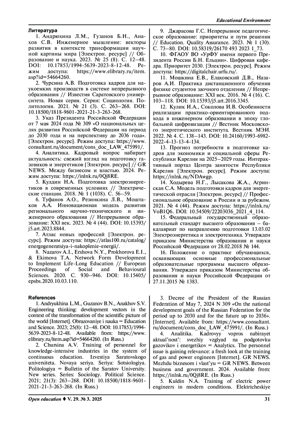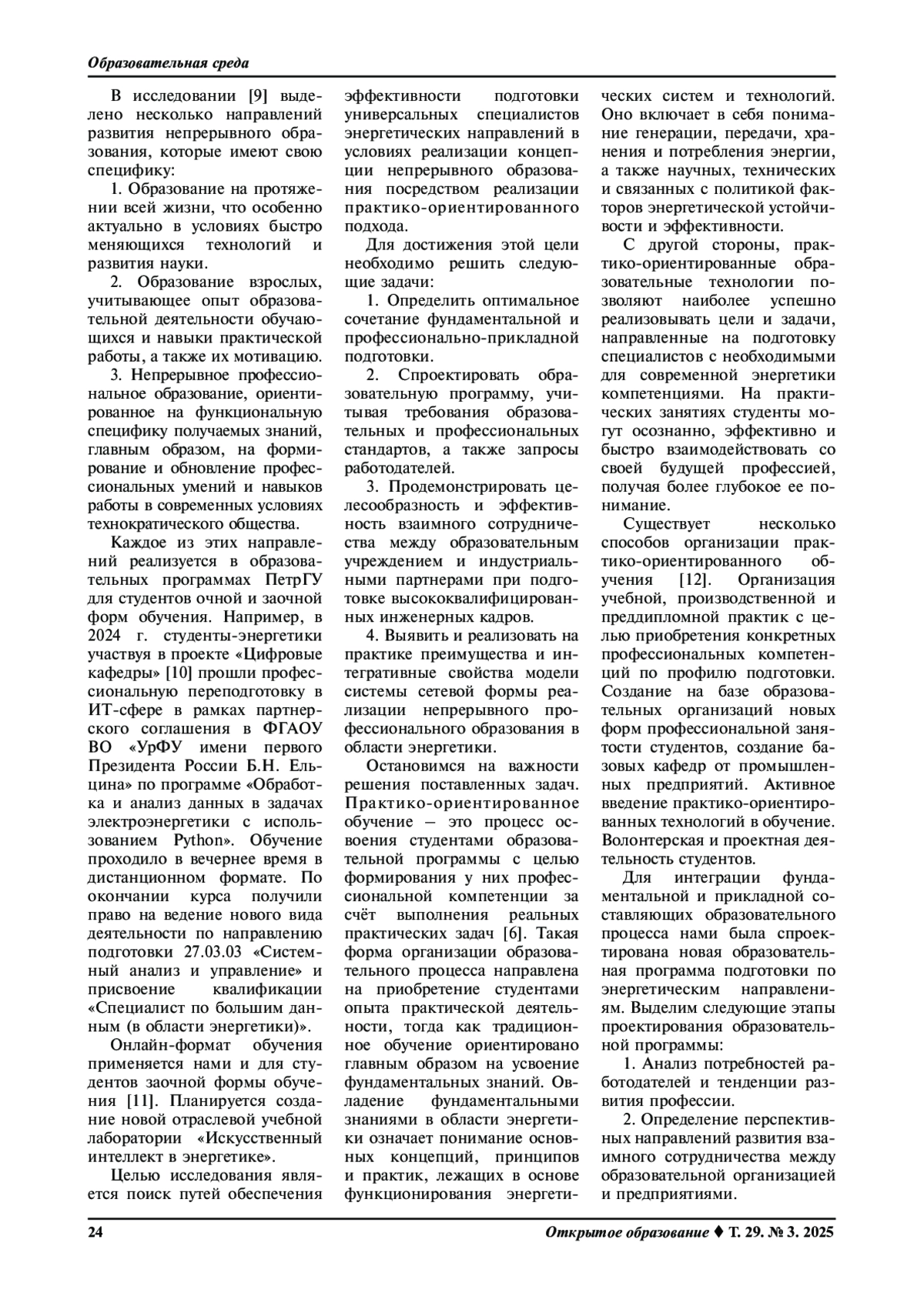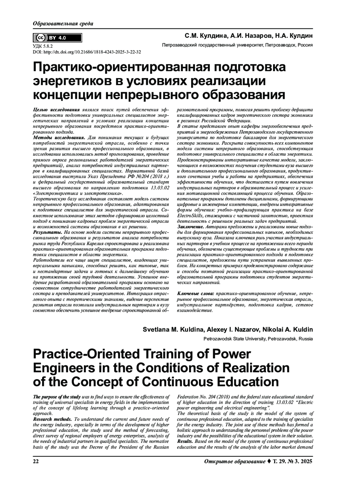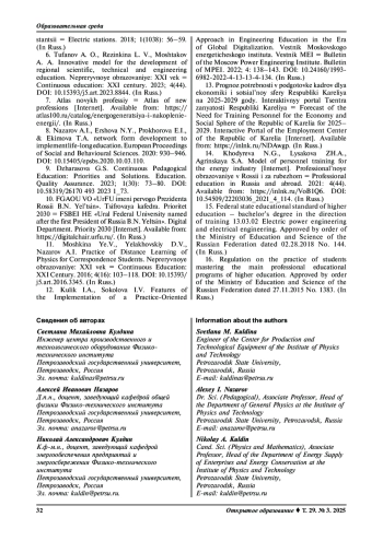 КУЛДИНА С. М., НАЗАРОВ А. И., КУЛДИН Н. А. ПРАКТИКО-ОРИЕНТИРОВАННАЯ ПОДГОТОВКА ЭНЕРГЕТИКОВ В УСЛОВИЯХ РЕАЛИЗАЦИИ КОНЦЕПЦИИ НЕПРЕРЫВНОГО ОБРАЗОВАНИЯ // ОТКРЫТОЕ ОБРАЗОВАНИЕ. 2025. ТОМ 29, № 3