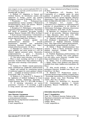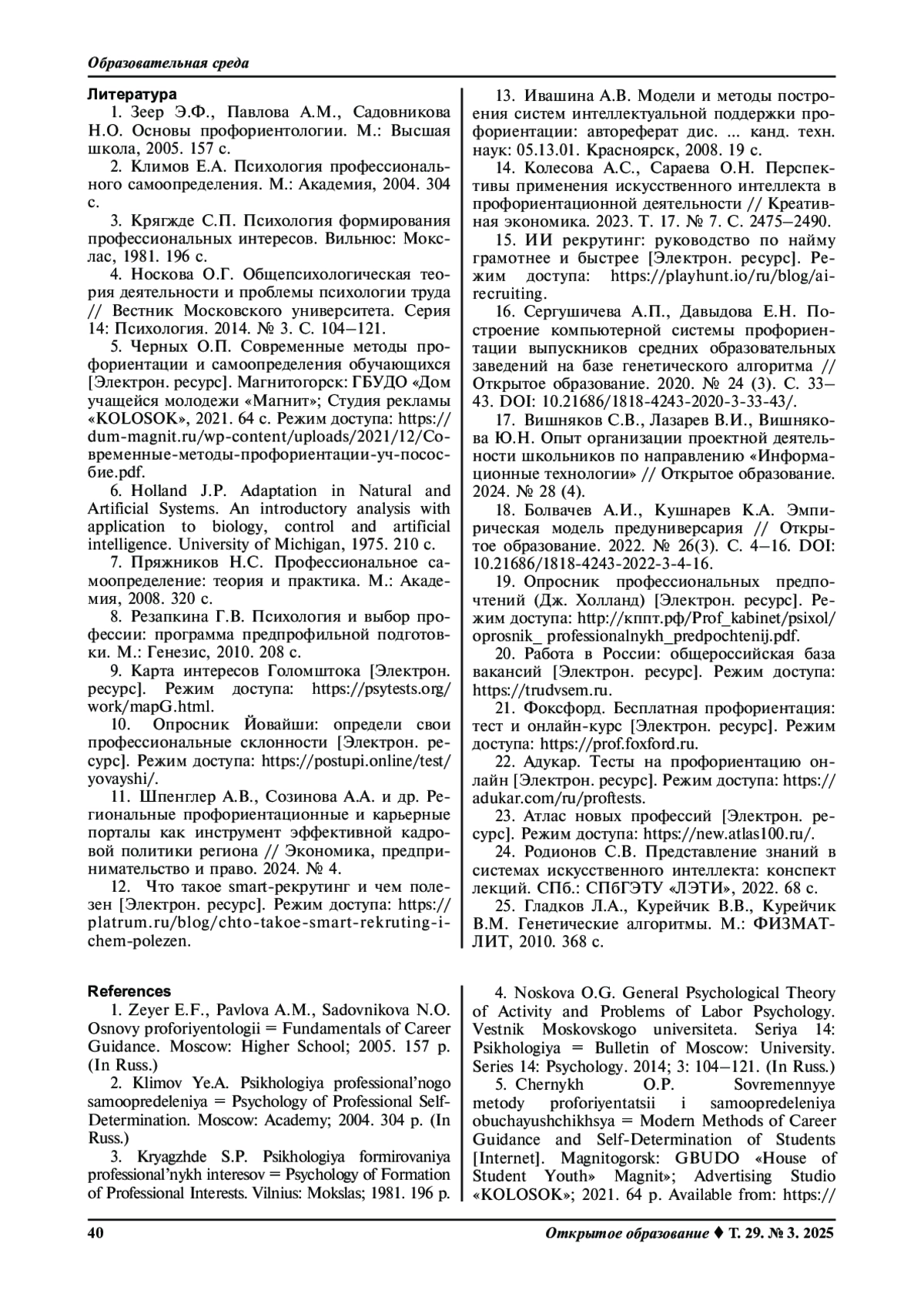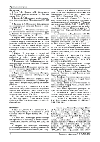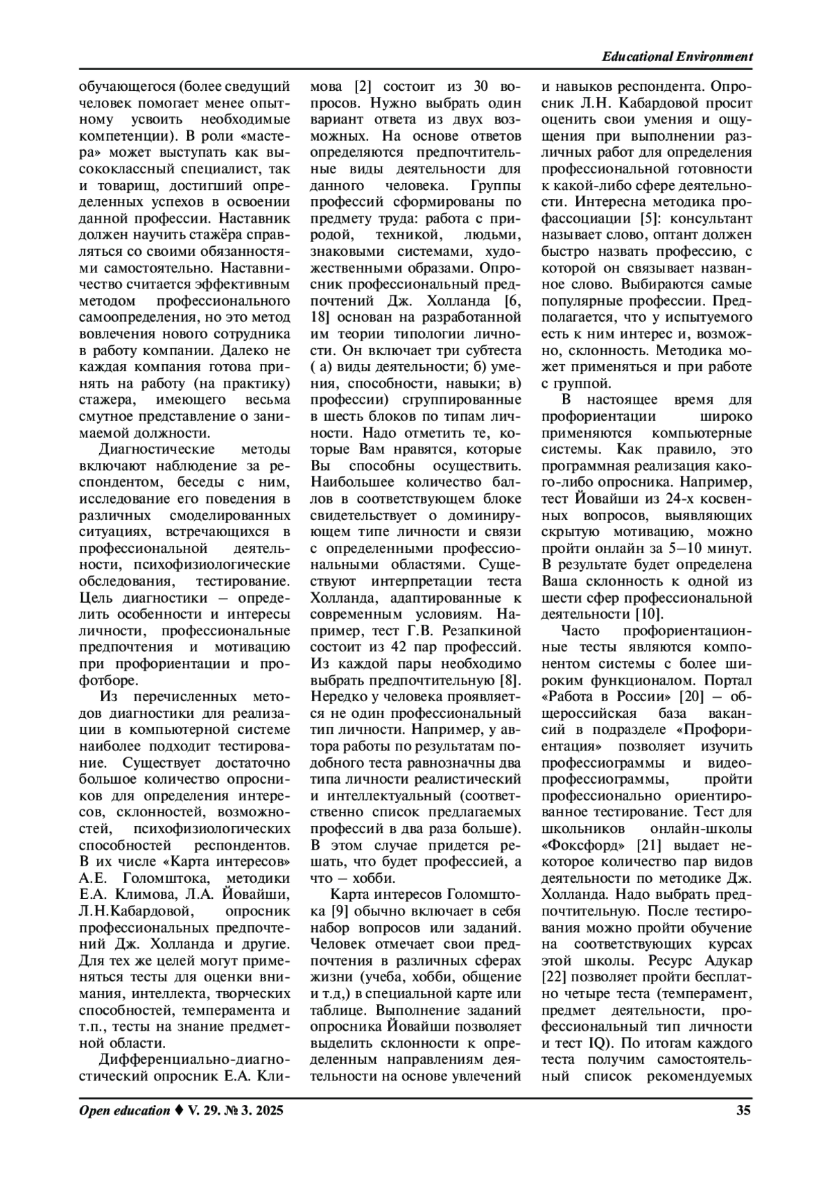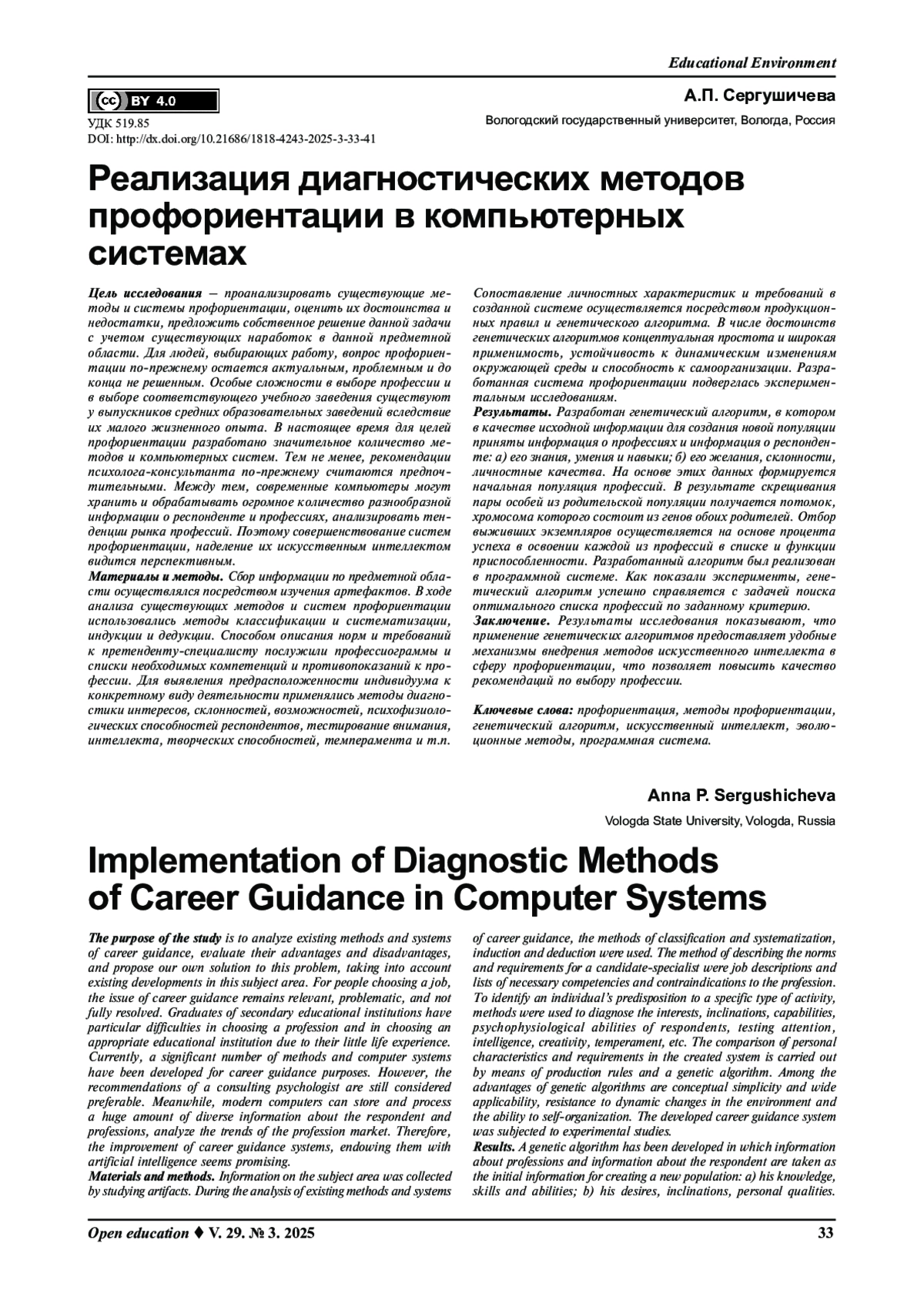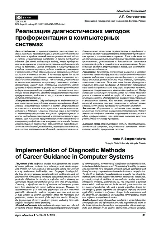 СЕРГУШИЧЕВА А. П. РЕАЛИЗАЦИЯ ДИАГНОСТИЧЕСКИХ МЕТОДОВ ПРОФОРИЕНТАЦИИ В КОМПЬЮТЕРНЫХ СИСТЕМАХ // ОТКРЫТОЕ ОБРАЗОВАНИЕ. 2025. ТОМ 29, № 3