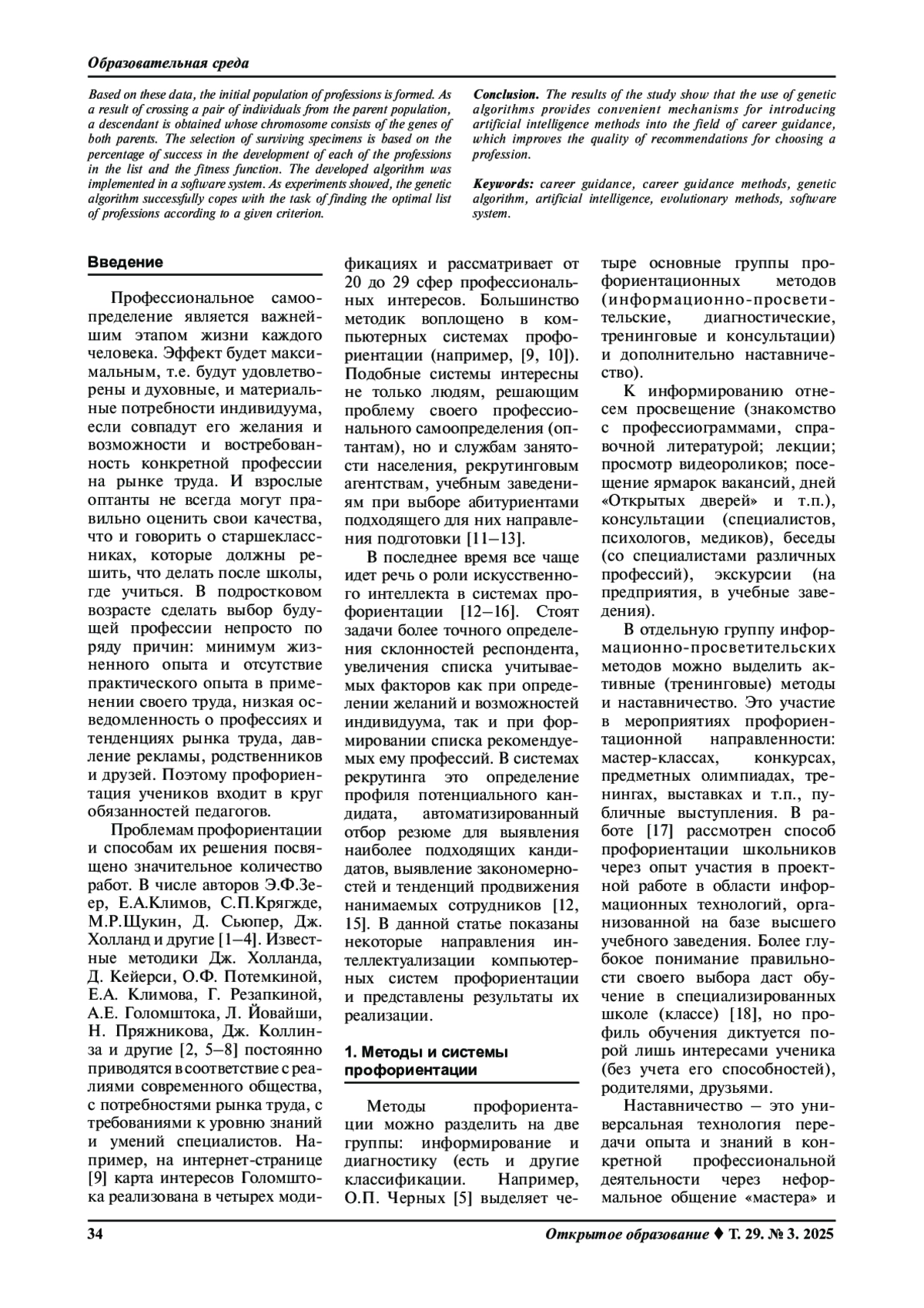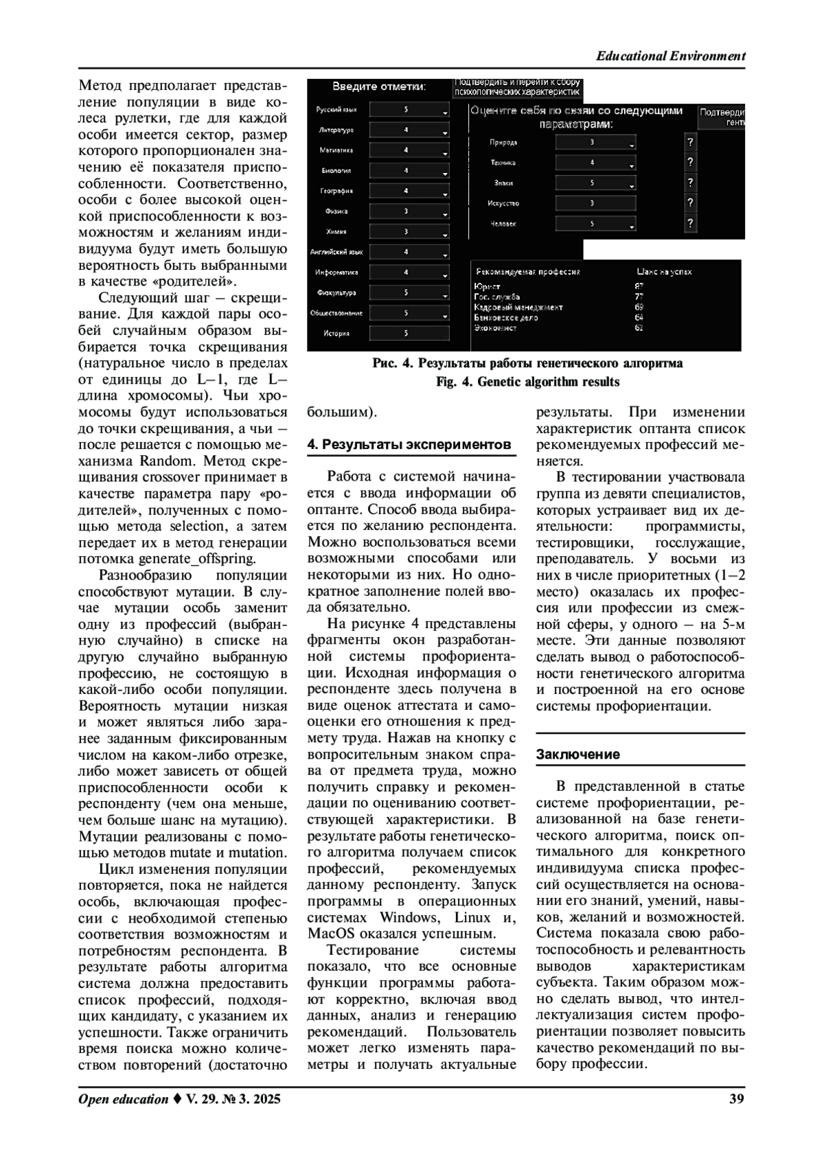 Заключение. Результаты исследования показывают, что применение генетических алгоритмов предоставляет удобные механизмы внедрения методов искусственного интеллекта в сферу профориентации, что позволяет повысить качество рекомендаций по выбору профессии.