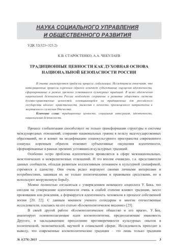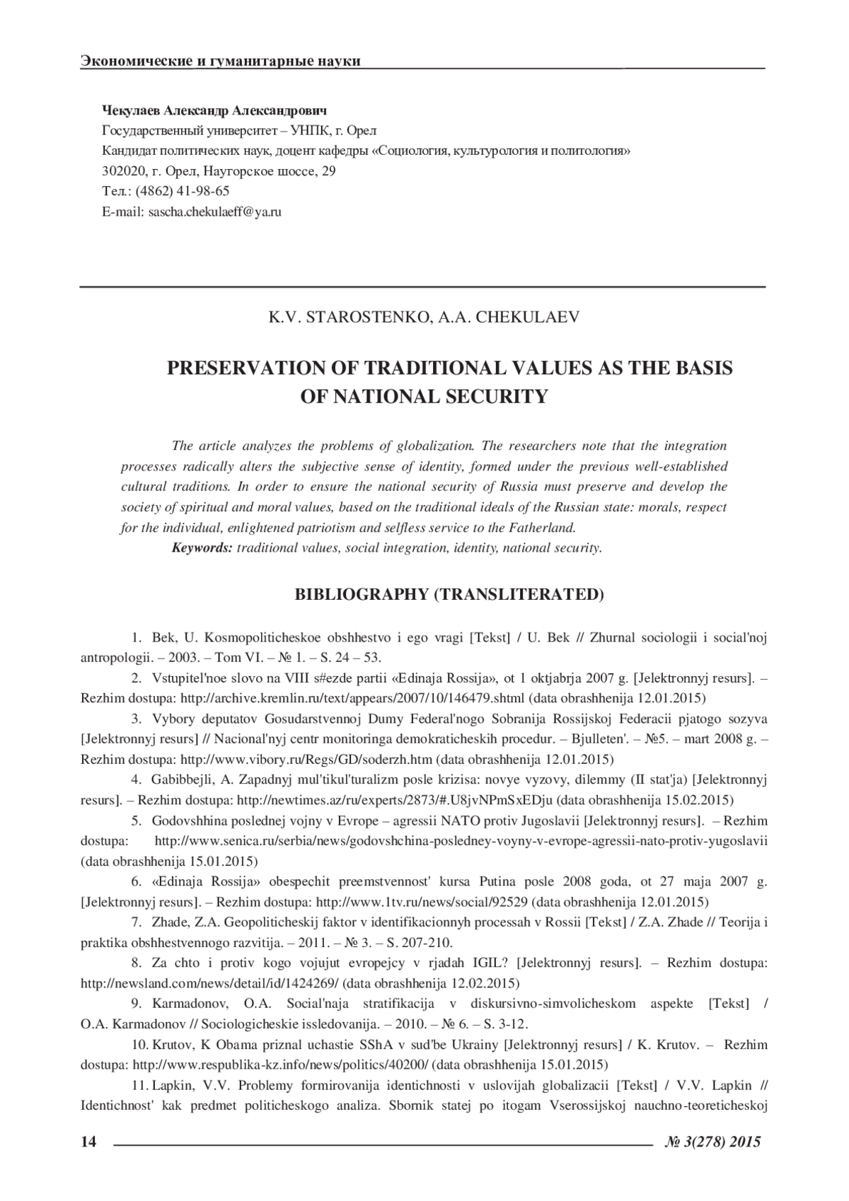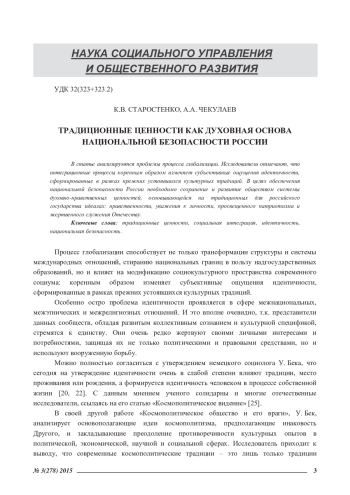 В статье анализируются проблемы процесса глобализации. Исследователи отмечают, что интеграционные процессы коренным образом изменяет субъективные ощущения идентичности, сформированные в рамках прежних устоявшихся культурных традиций. В целях обеспечения национальной безопасности России необходимо сохранение и развитие обществом системы духовно-нравственных ценностей, основывающейся на традиционных для российского государства идеалах: нравственности, уважения к личности, просвещенного патриотизма и жертвенного служения Отечеству