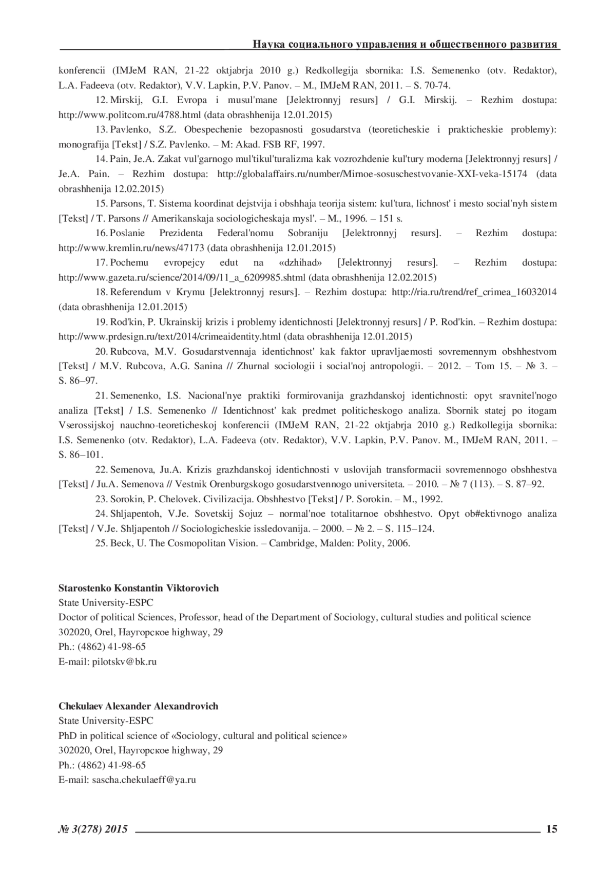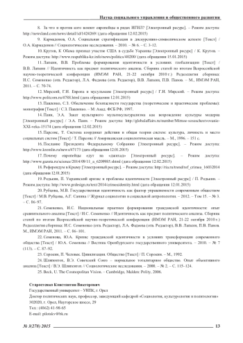 22. Семенова, Ю.А. Кризис гражданской идентичности в условиях трансформации современного общества [Текст] / Ю.А. Семенова // Вестник Оренбургского государственного университета. - 2010. - № 7 (113). - С. 87-92. EDN: MSSEYN