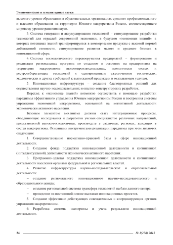 Кроме того, создание эффективного механизма управления макрорегиональной социально-экономической системой позволит на уровне макрорегиона эффективно решать приоритетные социально-экономические задачи в области когнитивной деятельности экономически активного населения, в сфере образования, науки и инноваций: