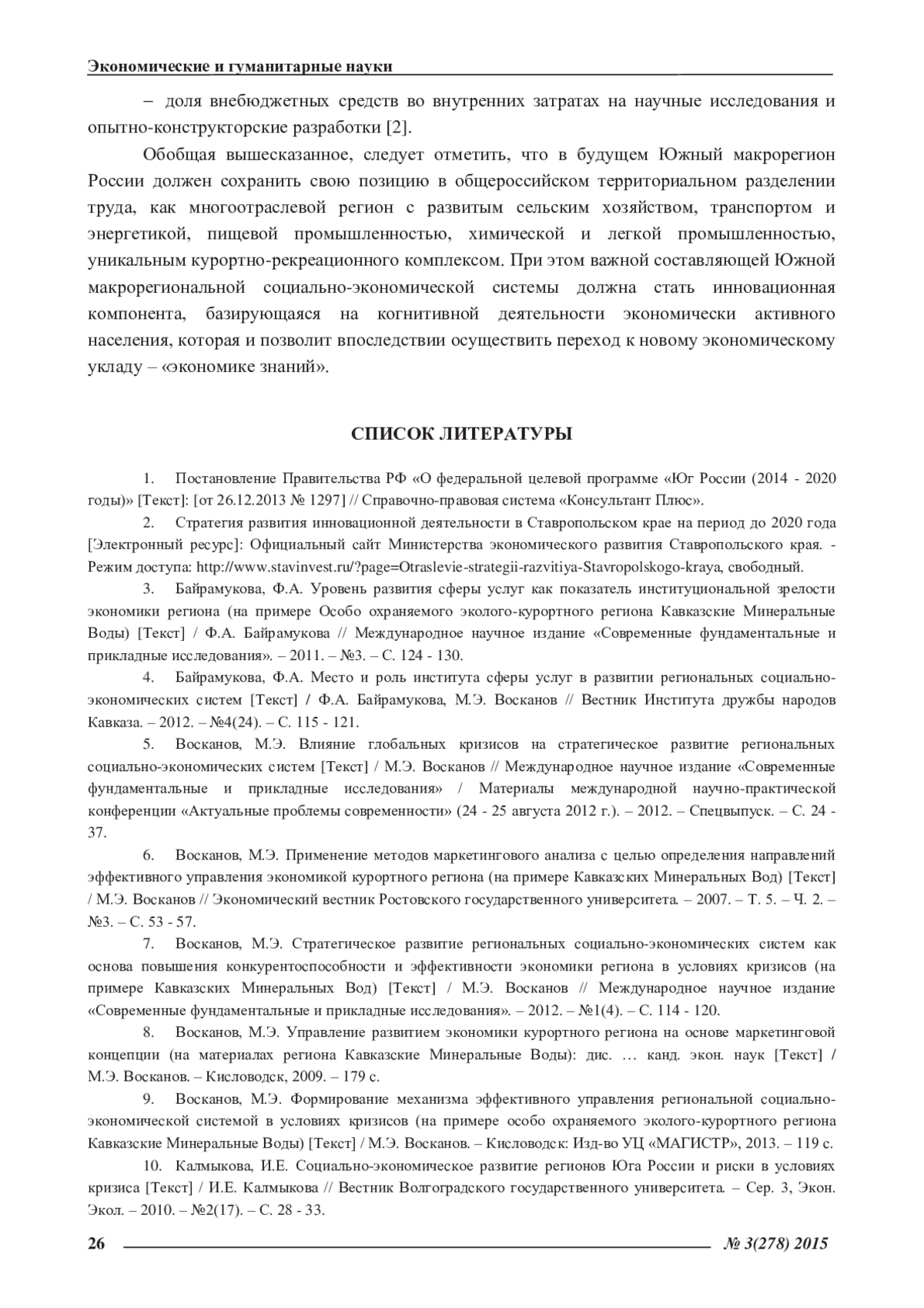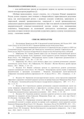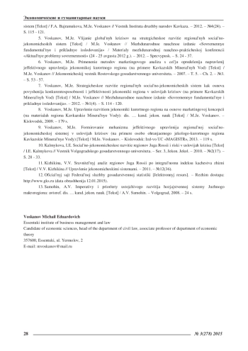 7. Восканов, М.Э. Стратегическое развитие региональных социально-экономических систем как основа повышения конкурентоспособности и эффективности экономики региона в условиях кризисов (на примере Кавказских Минеральных Вод) [Текст] / М.Э. Восканов // Международное научное издание «Современные фундаментальные и прикладные исследования». - 2012. - №1(4). - С. 114 - 120. EDN: OXNSIX