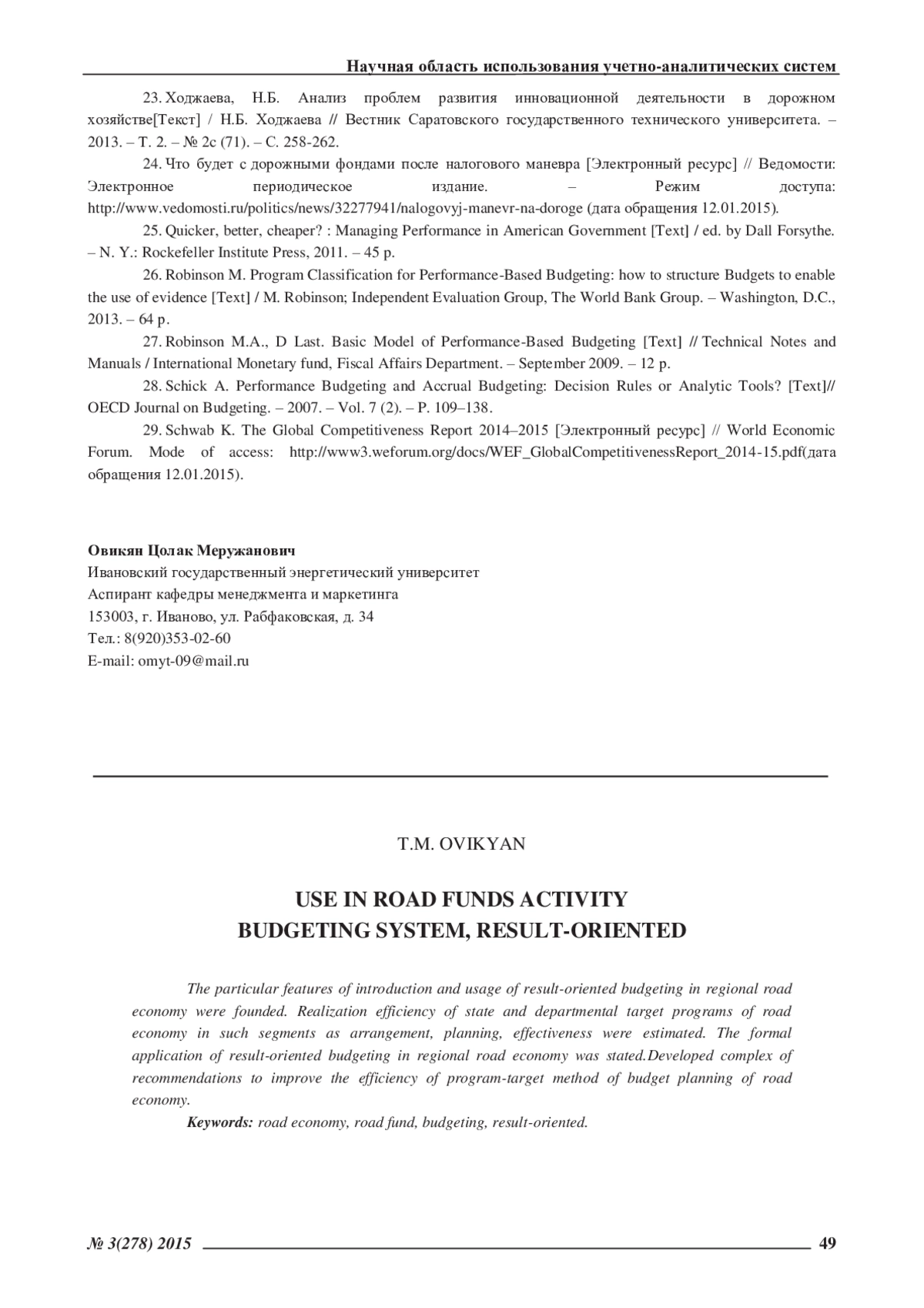 23. Ходжаева, Н.Б. Анализ проблем развития инновационной деятельности в дорожном хозяйстве[Текст] / Н.Б. Ходжаева // Вестник Саратовского государственного технического университета. - 2013. - Т. 2. - № 2c (71). - С. 258-262. EDN: RCNIQX