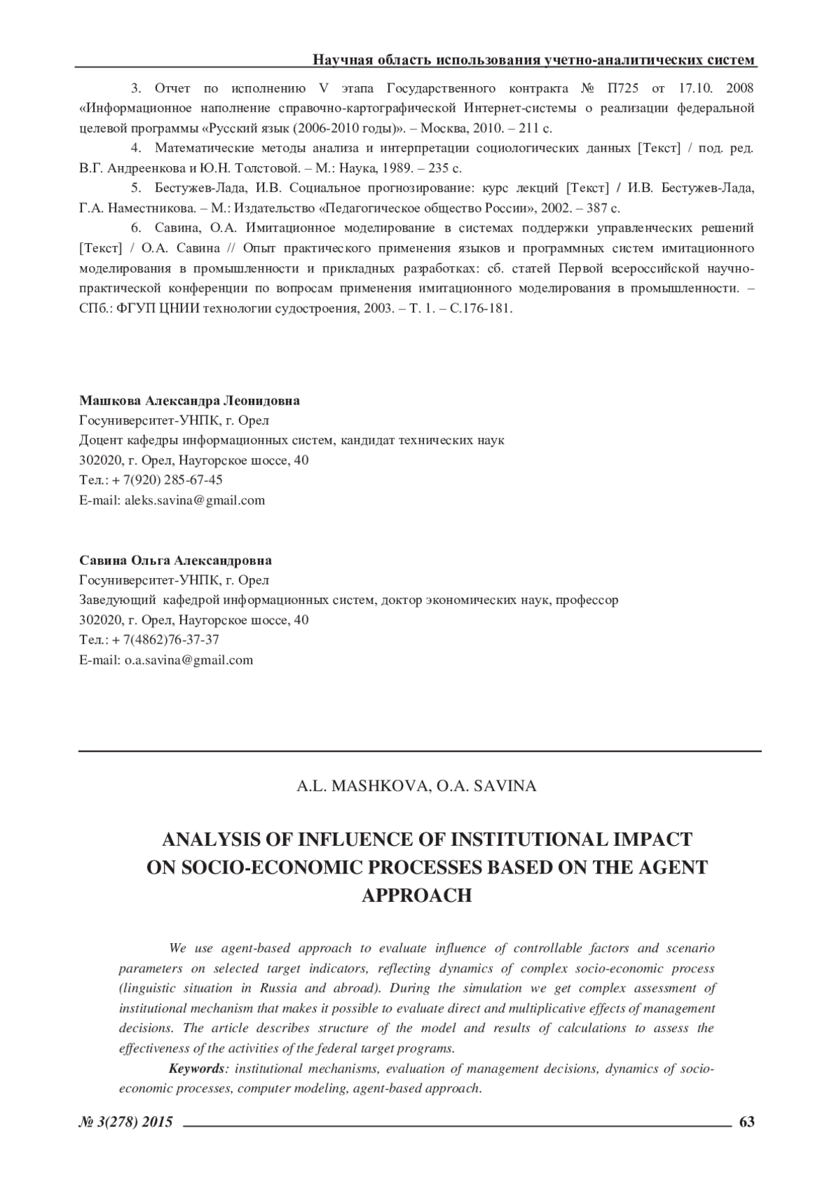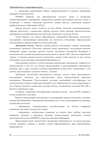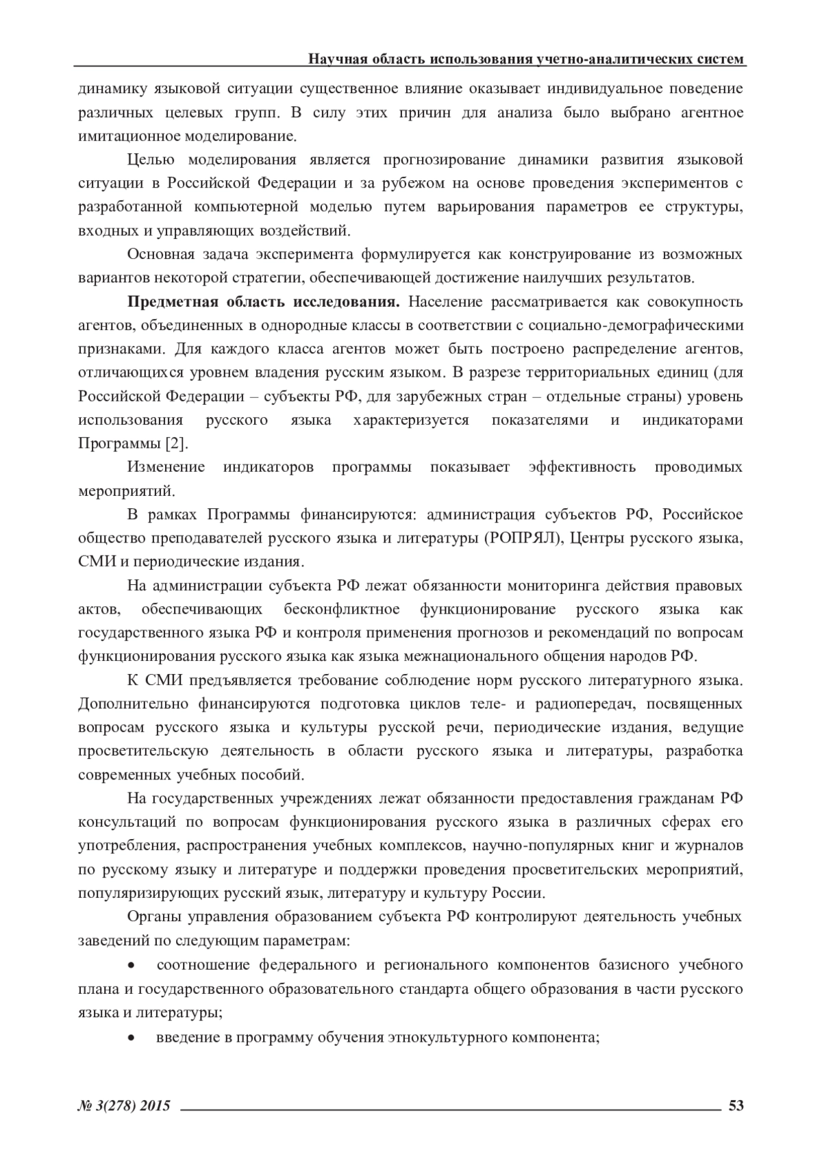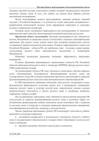 На основе агентного подхода осуществляется учет влияния управляемых факторов и сценарных параметров на выделенные целевые индикаторы, отражающие развитие сложного социально-экономического процесса (языковой ситуации в России и за рубежом). В процессе моделирования получается комплексная оценка результатов конкретного действия институционального механизма, что дает возможность оценивать прямые и мультипликативные последствия принимаемых решений. В статье описана структура модели и приведены результаты многовариантных расчетов по оценке эффективности мероприятий федеральной целевой программы
