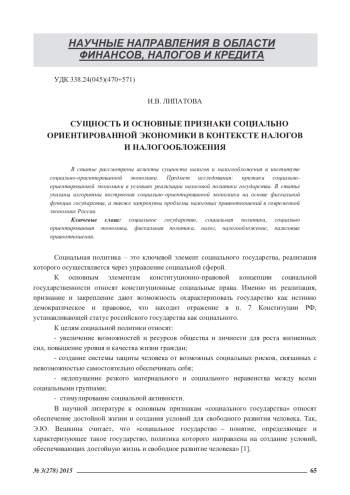 В статье рассмотрены аспекты сущности налогов и налогообложения в институте социально-ориентированной экономики. Предмет исследования: признаки социальноориентированной экономики в условиях реализации налоговой политики государства. В статье указаны алгоритмы построения социально-ориентированной экономики на основе фискальной функции государства, а также затронуты проблемы налоговых правоотношений в современной экономике России