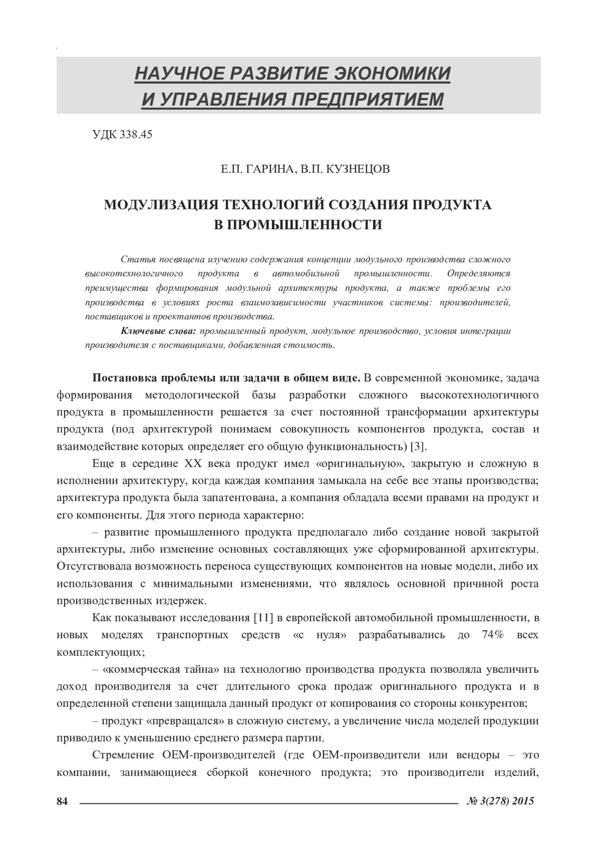 Статья посвящена изучению содержания концепции модульного производства сложного высокотехнологичного продукта в автомобильной промышленности. Определяются преимущества формирования модульной архитектуры продукта, а также проблемы его производства в условиях роста взаимозависимости участников системы: производителей, поставщиков и проектантов производства