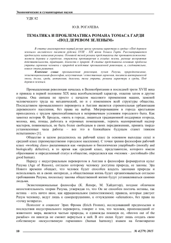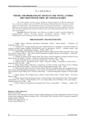 В статье анализируется первый роман цикла «романы характера и среды» «Под деревом зеленым» английского писателя рубежа XVIII - XIX веков Томаса Гарди. Рассматриваются предпосылки написания романа. Основной темой романа представлены две противоположности: жители деревни и городские, отражены противоречия в укладах жизни, разнице восприятия действительности, традициях, близости к природе. В статье представлена основная проблема утраты гармонии человека с природой вследствие промышленной революции, а, следовательно, нового этапа развития