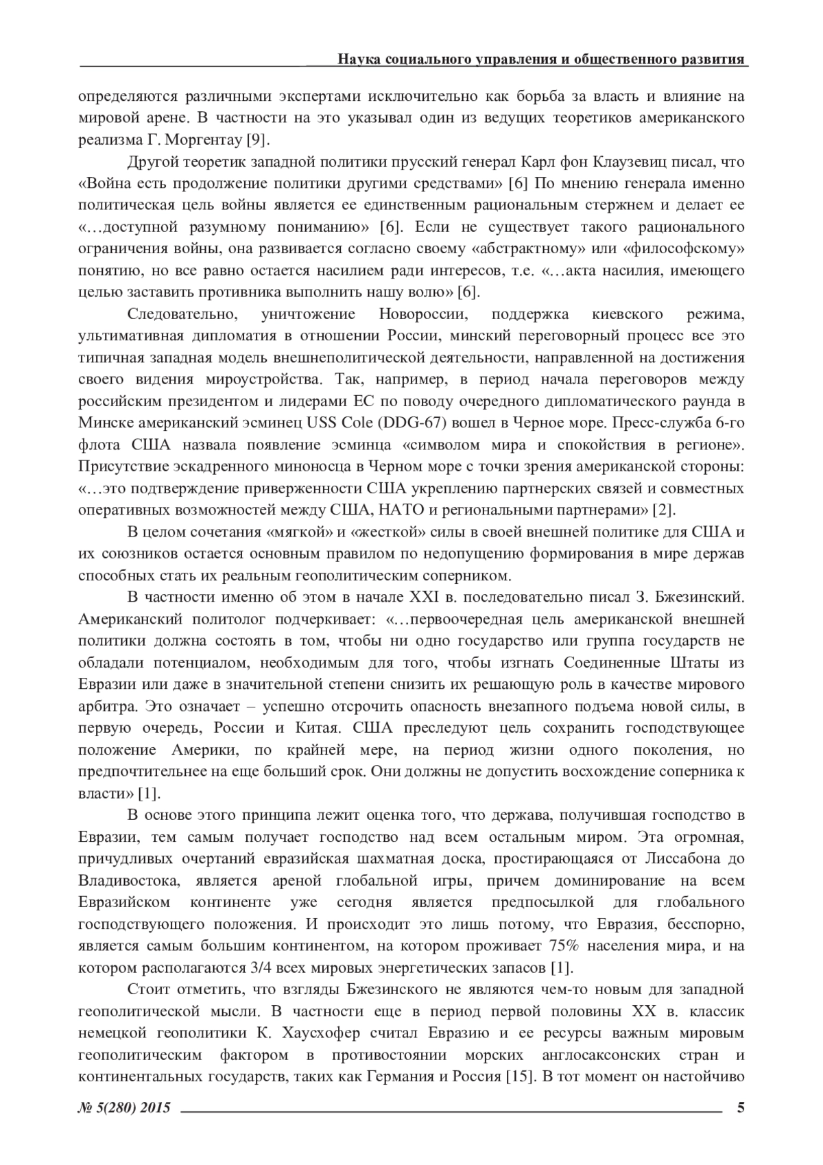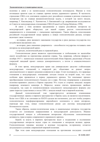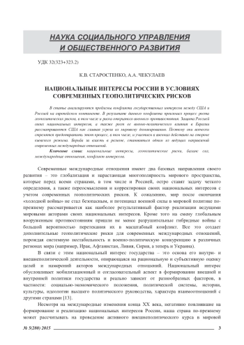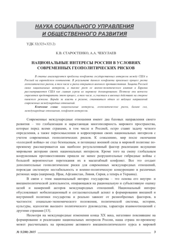 Современные международные отношения имеют два базовых направления своего развития – это глобализация и нарастающая многополярность мирового пространства, которые перед всеми странами, в том числе и Россией, остро ставят задачу четкого определения, а также переосмысления и корректировки своих национальных интересов с учетом современных геополитических рисков. К сожалению, мир после окончания «холодной войны» не стал безопасным, и потенциал военной силы в мировой политике попрежнему рассматривается как наиболее результативный фактор реализации ведущими мировыми акторами своих национальных интересов. Кроме того на смену глобальным вооруженным противостояниям пришли не менее разрушительные гибридные войны с большой вероятностью перетекания их в масштабный конфликт. Все это создает дополнительные геополитические риски для современных международных отношений, порождая системную нестабильность и военно-политическую конкуренцию в различных регионах мира (например, Ирак, Афганистан, Ливия, Сирия, а теперь и Украина).